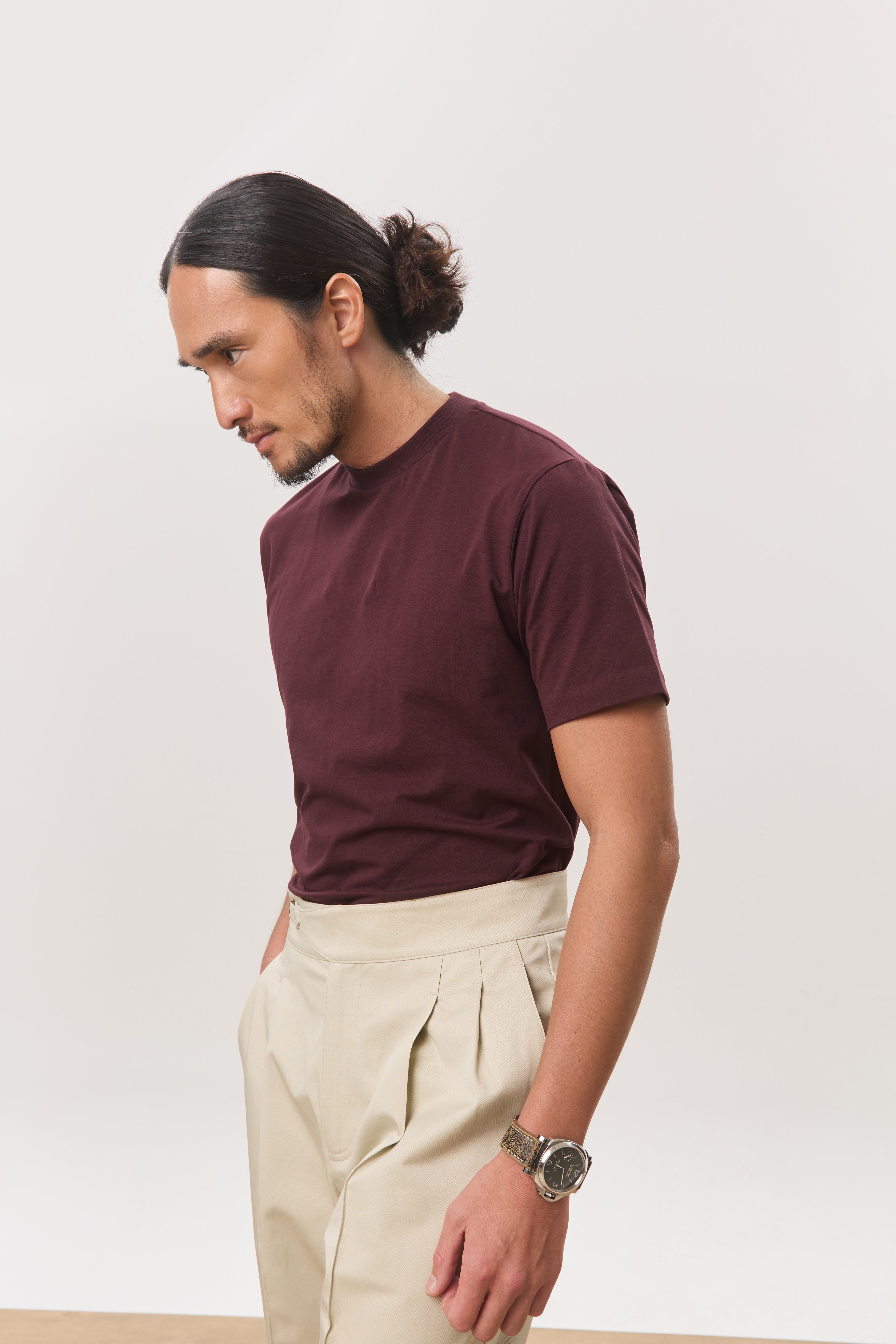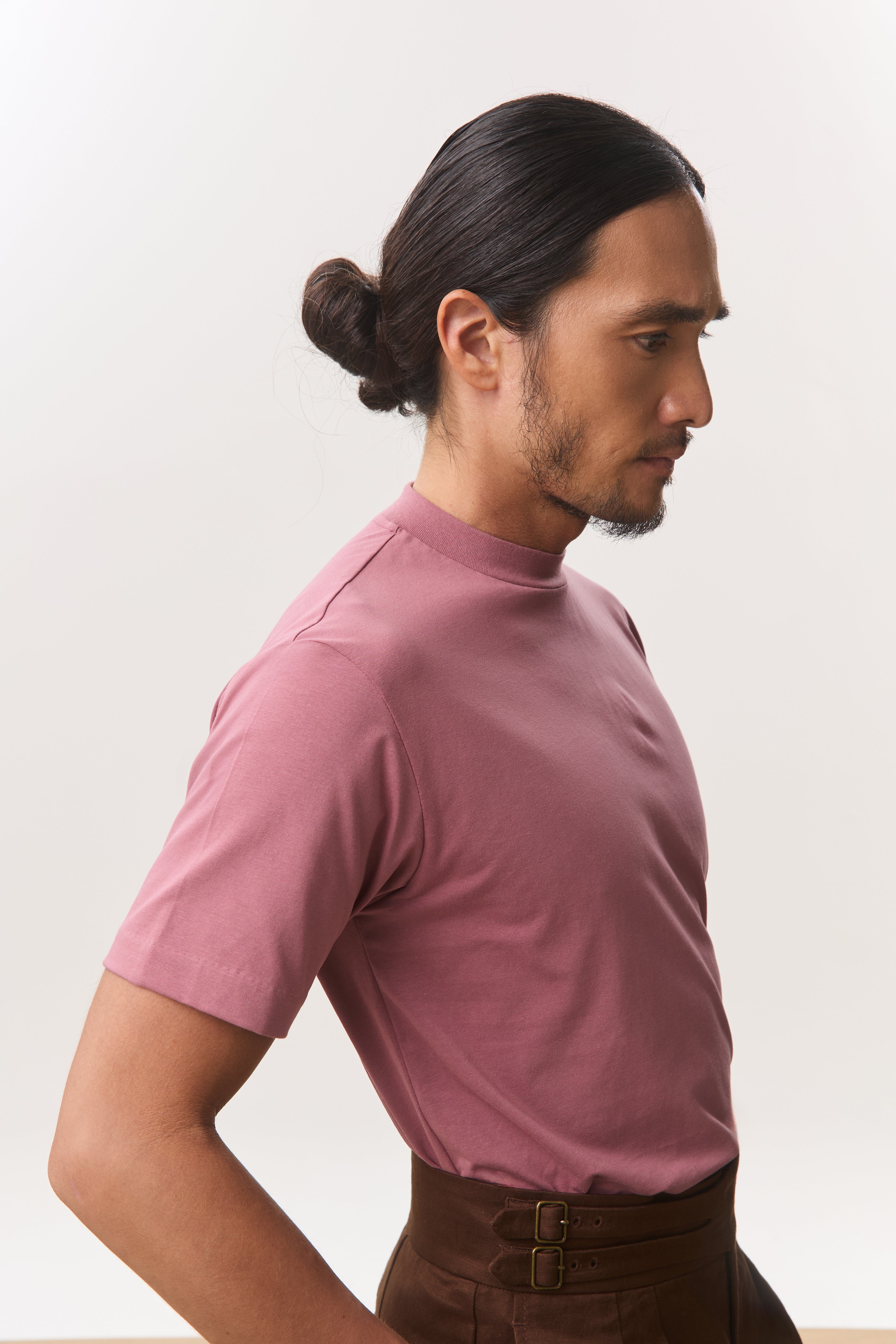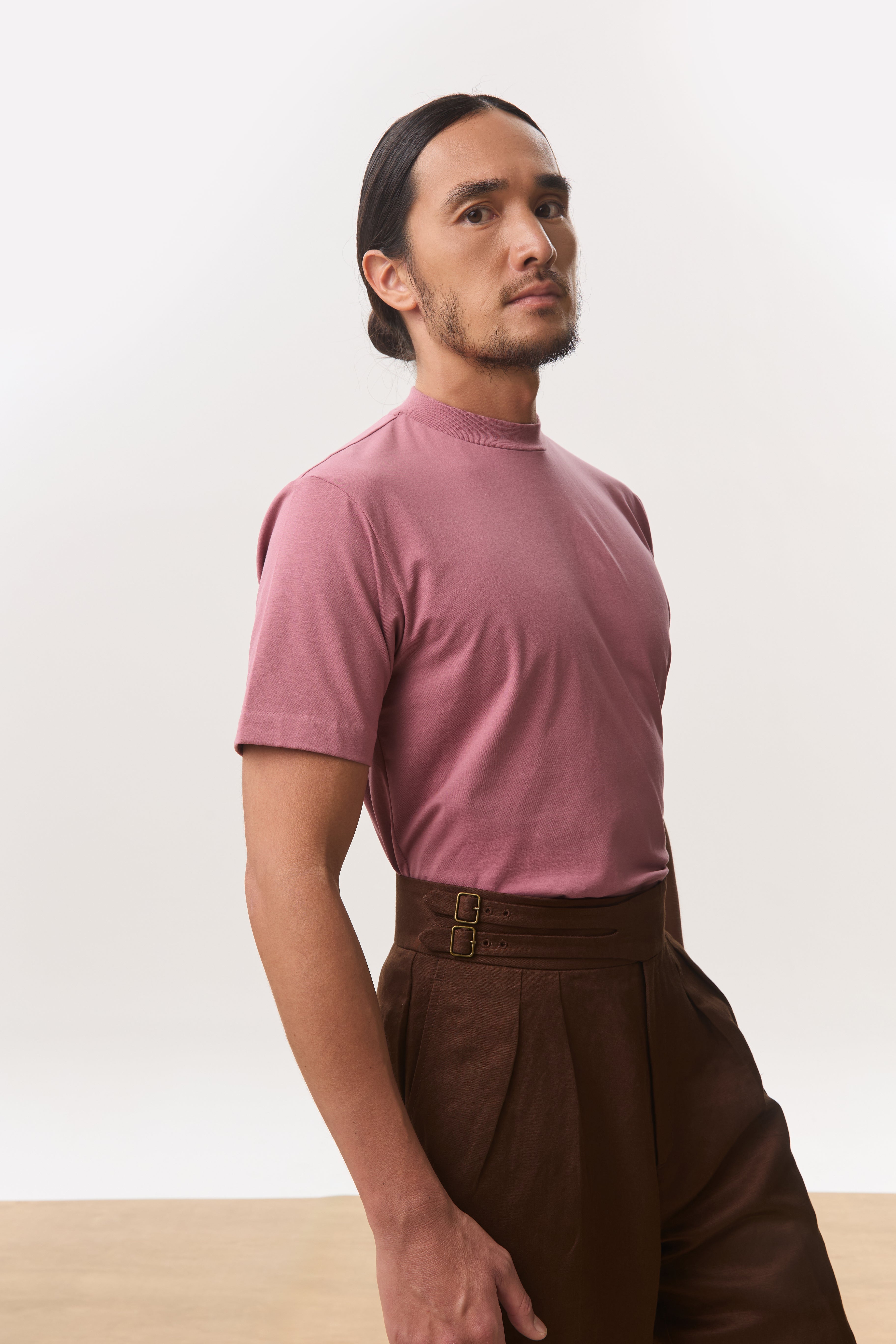 Tee in soft cotton jersey with a slim silhouette and a modern mock neckline. Designed with side slits for ease and movement. A polished alternative to the classic tee; ideal for days when you want to look sharp but stay casual.