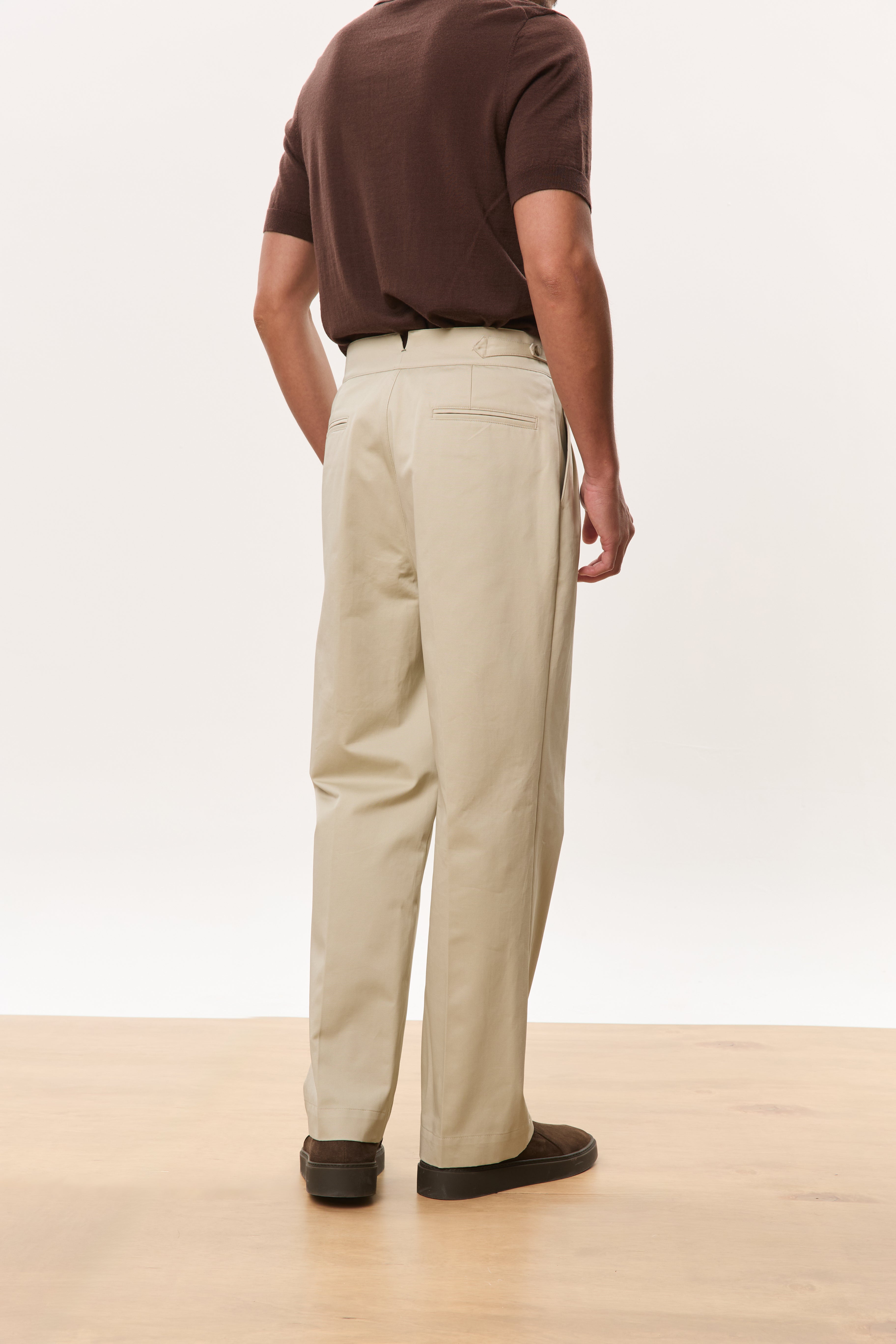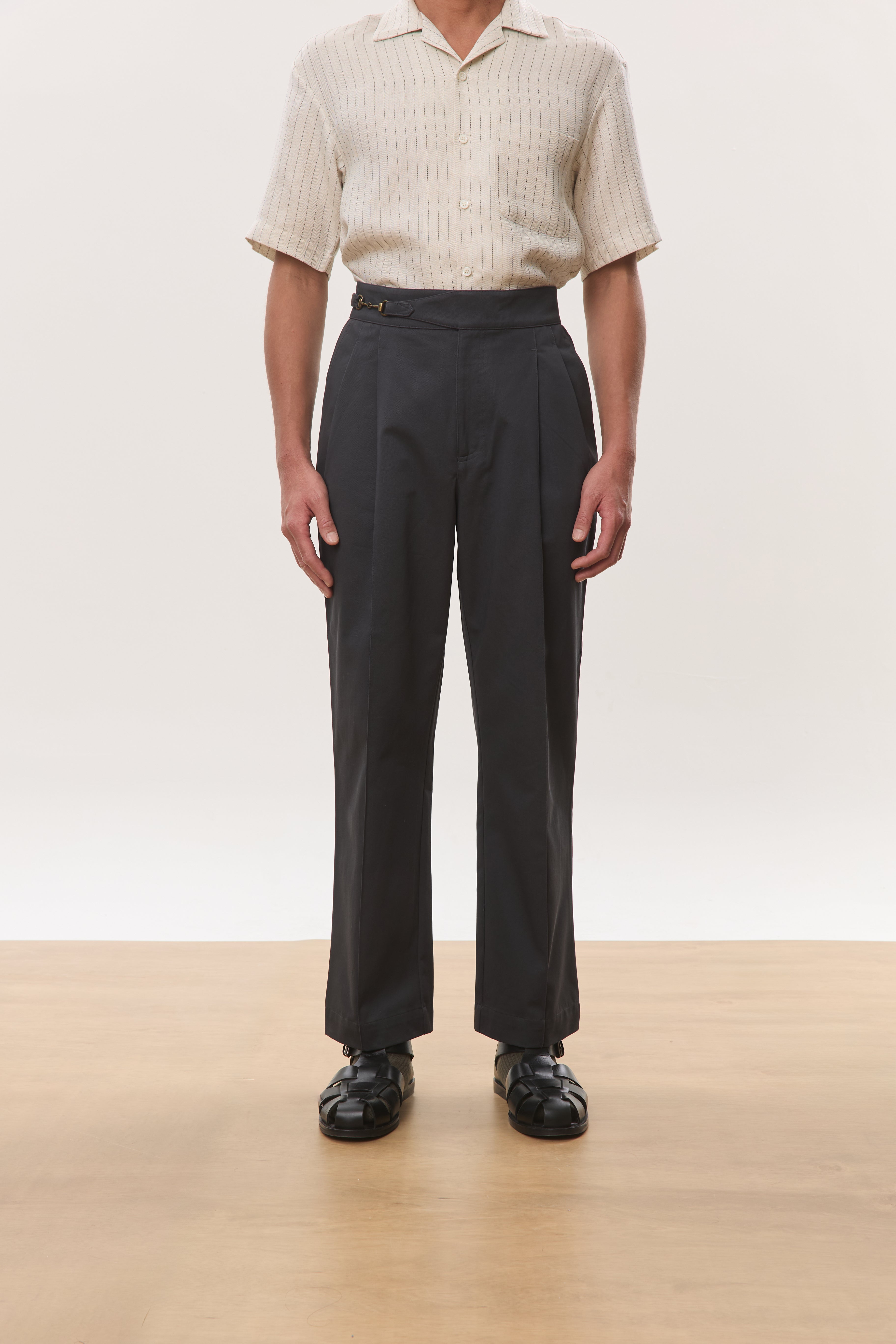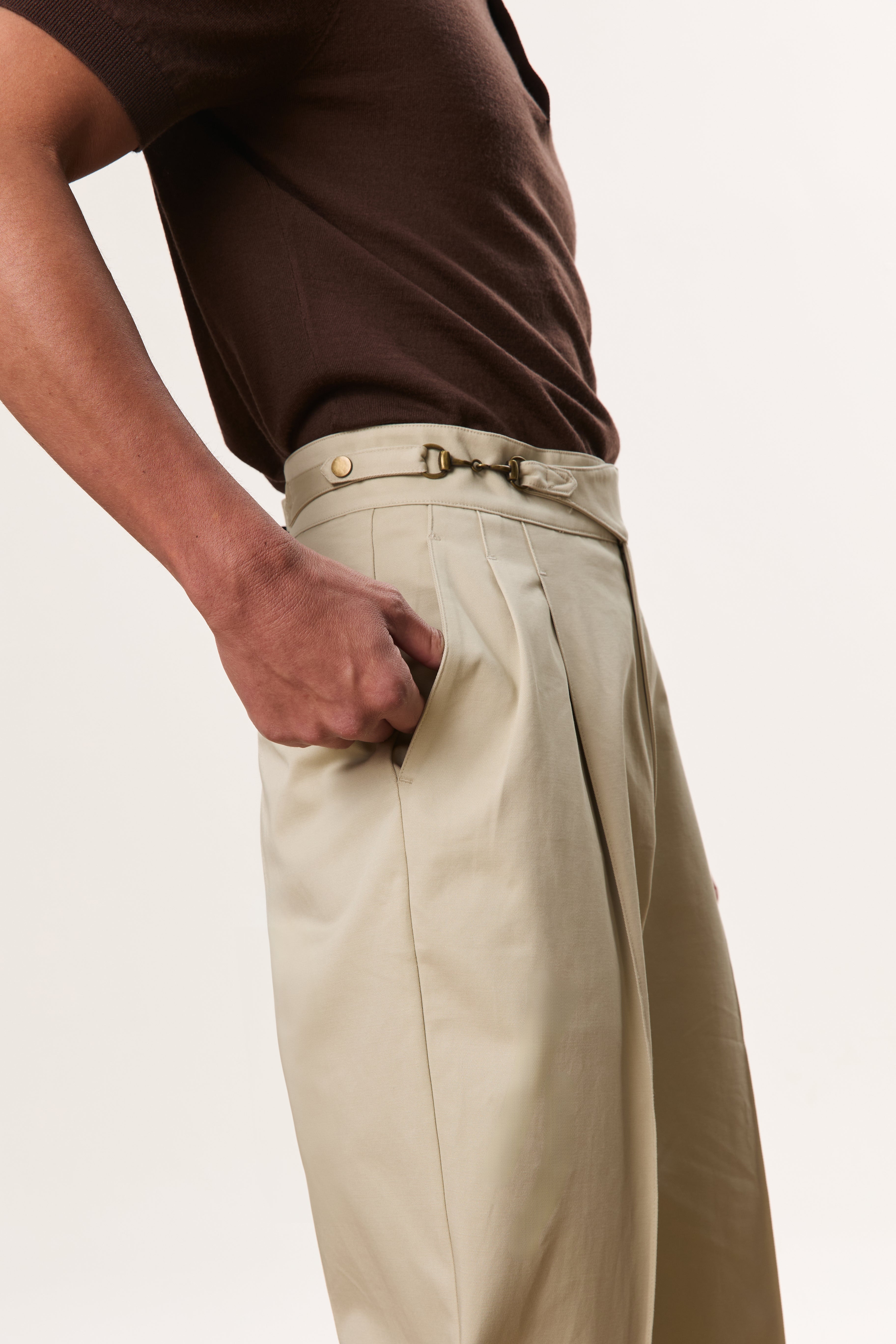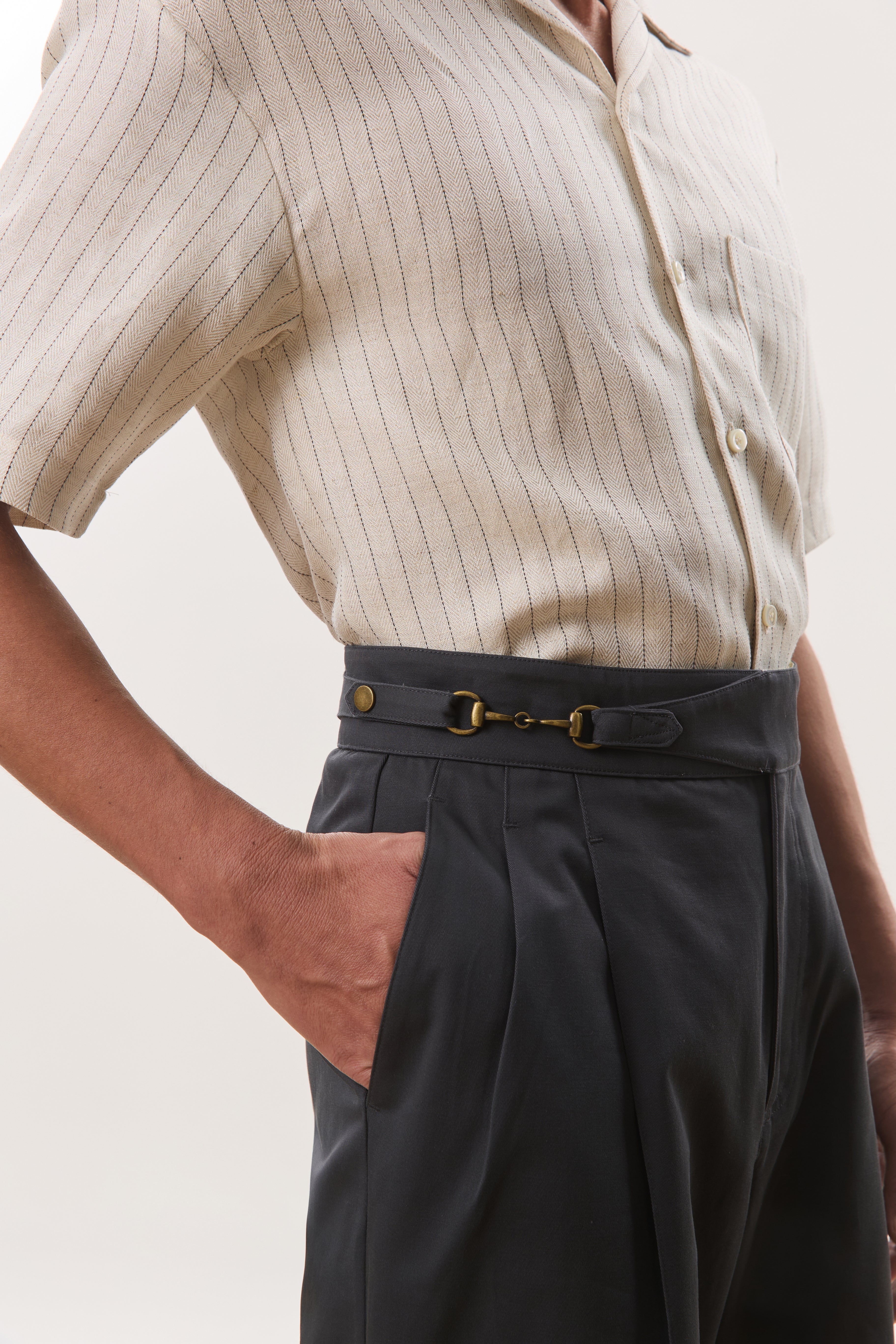 Designed with a strong, architectural silhouette, the Jann horsebit Gurkha trousers are cut from durable yet breathable 250gsm cotton twill for structure and everyday comfort. The high-waisted fit is anchored by signature Gurkha detailing with a horse-bit side fastening, while double forward-facing pleats create volume through the leg without sacrificing clean lines. Finished with double welt pockets at the rear, Jann balances classic tailoring with a modern, wide-leg proportion that works effortlessly across casual and elevated settings.