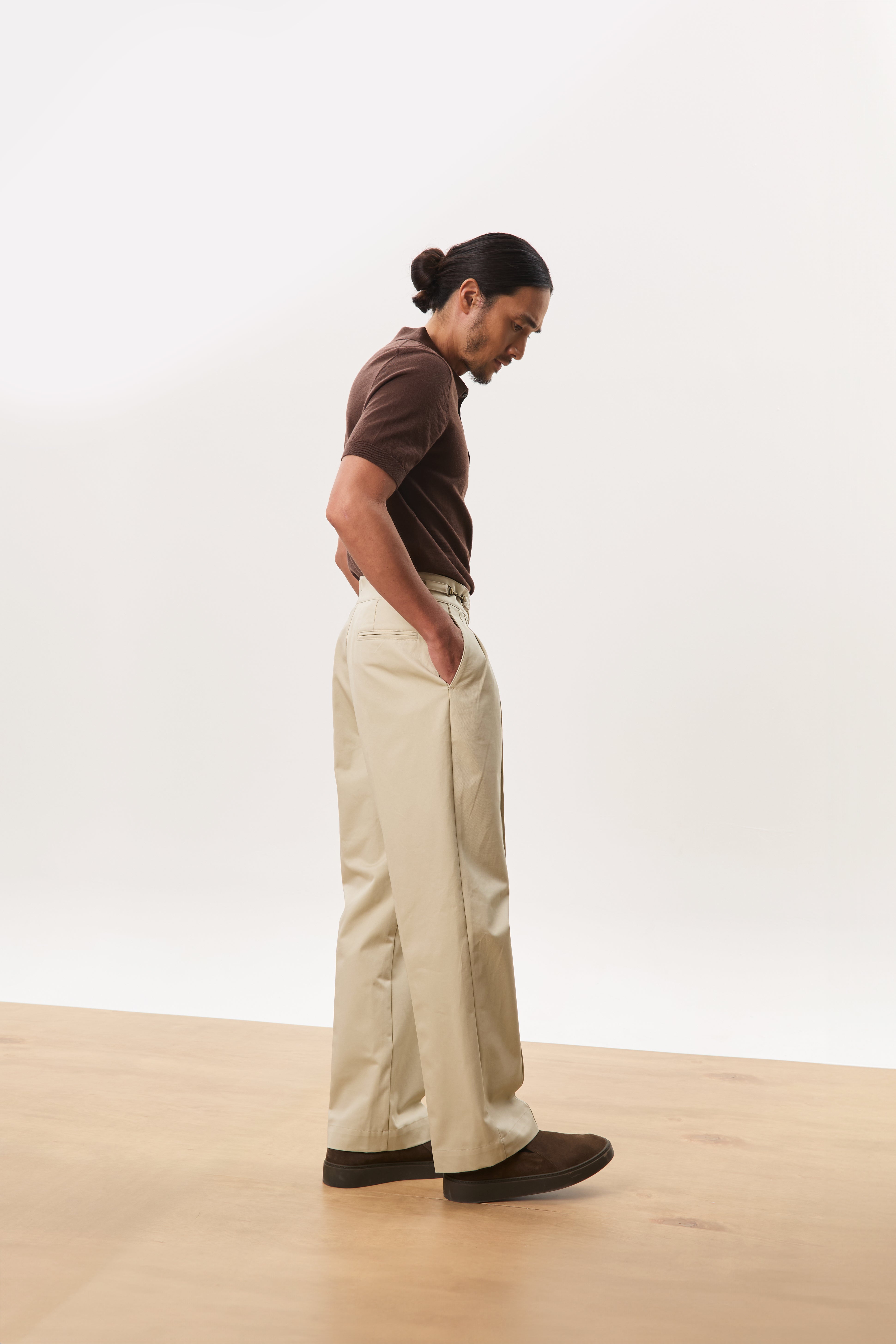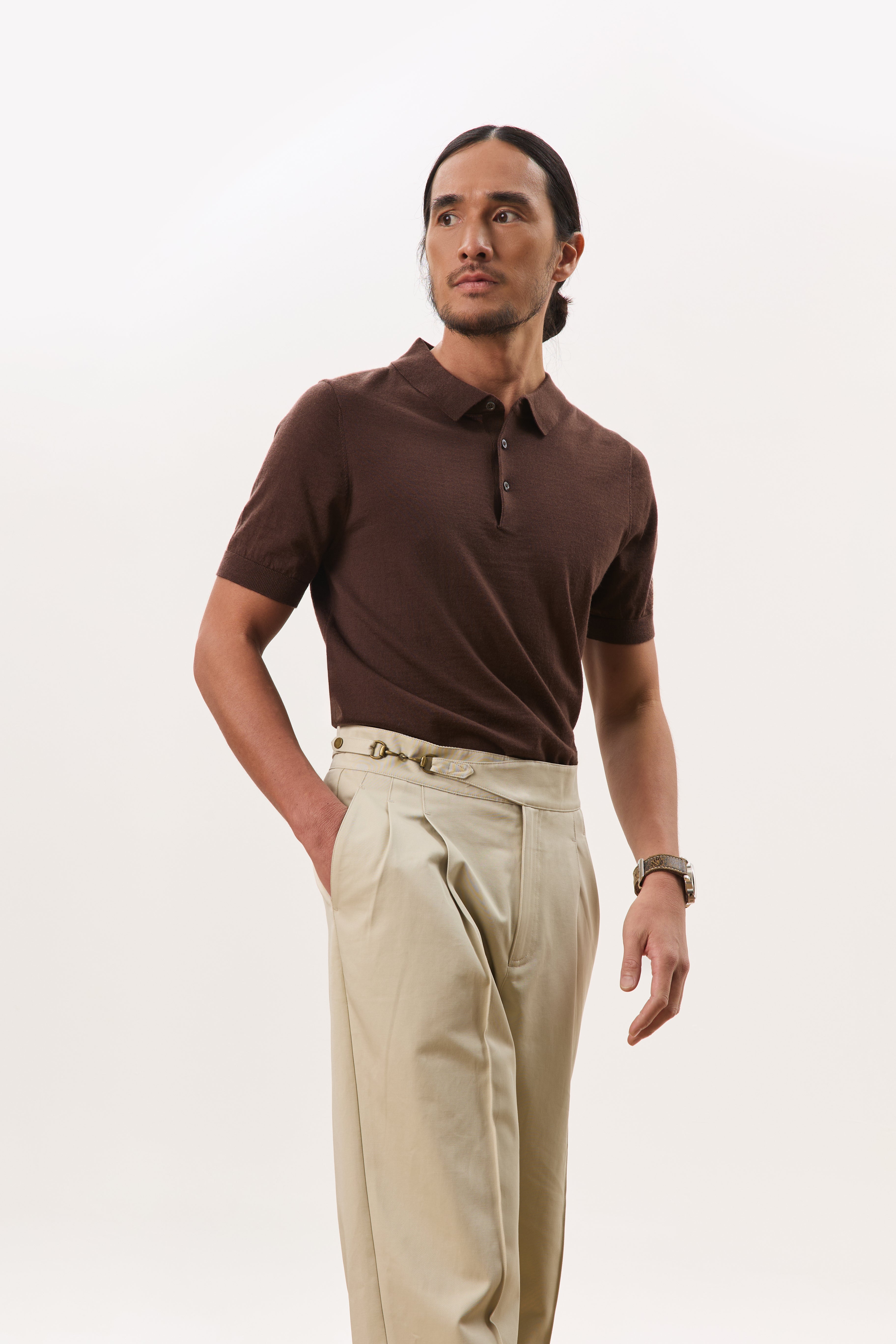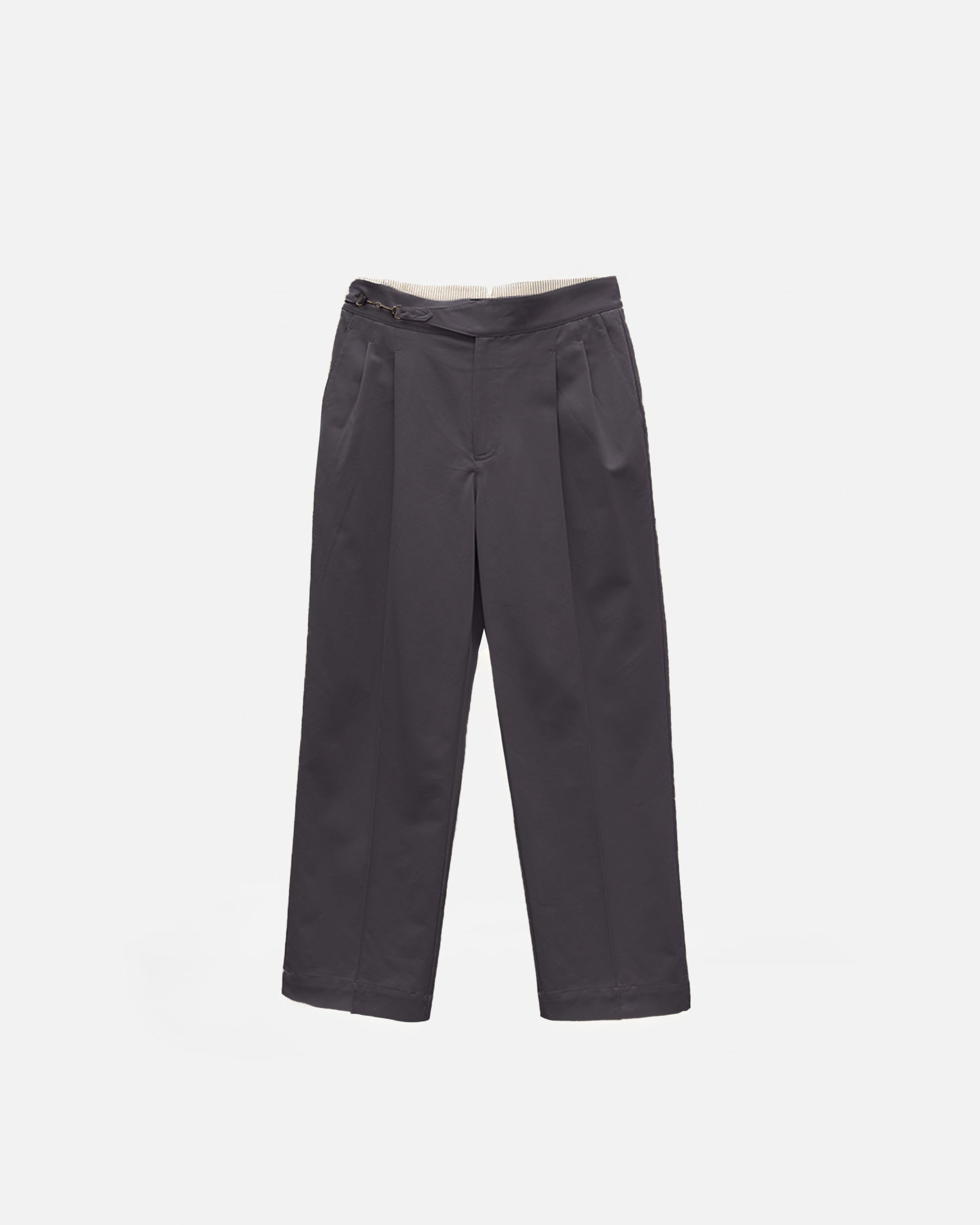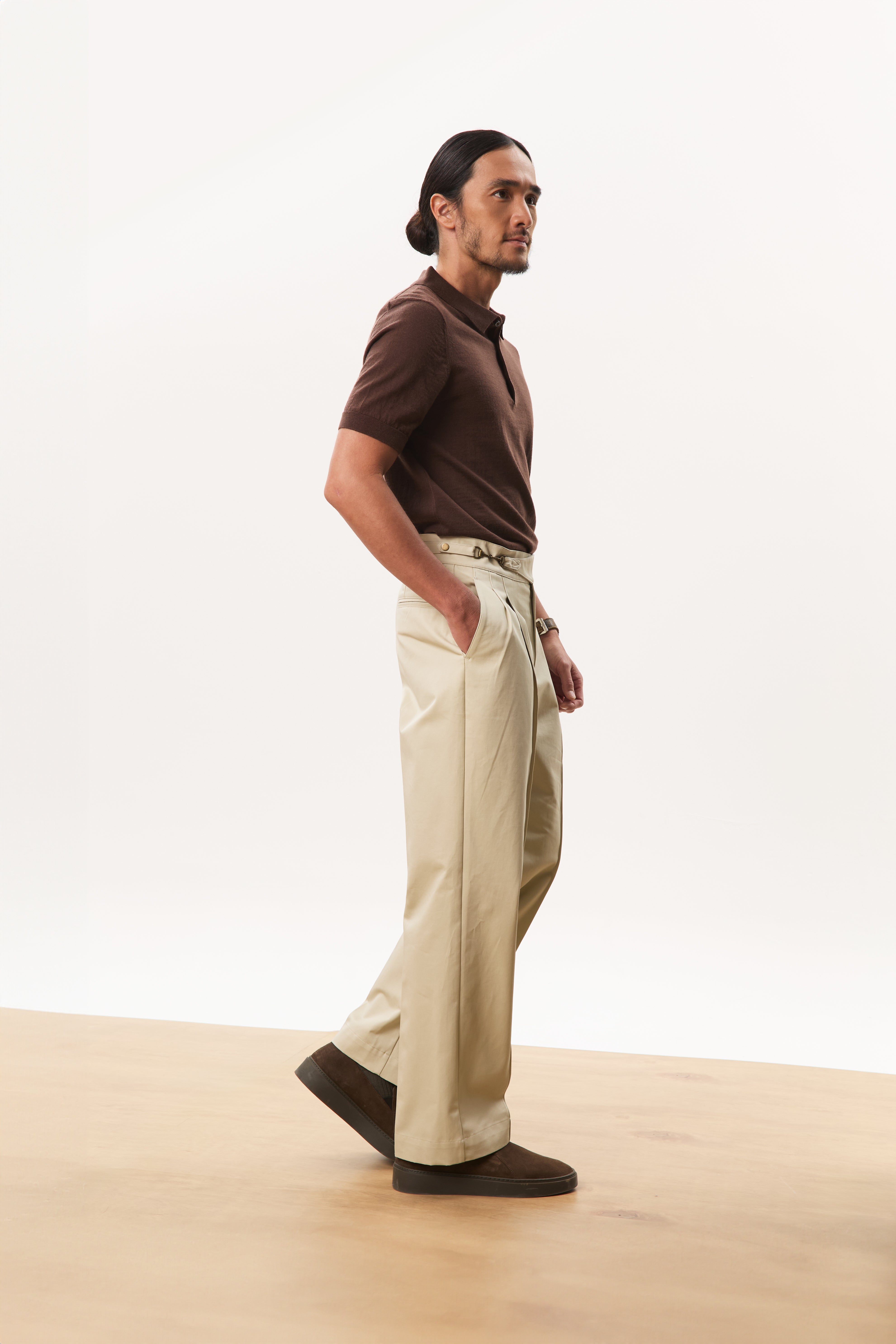 Designed with a strong, architectural silhouette, the Jann horsebit Gurkha trousers are cut from durable yet breathable 250gsm cotton twill for structure and everyday comfort. The high-waisted fit is anchored by signature Gurkha detailing with a horse-bit side fastening, while double forward-facing pleats create volume through the leg without sacrificing clean lines. Finished with double welt pockets at the rear, Jann balances classic tailoring with a modern, wide-leg proportion that works effortlessly across casual and elevated settings.