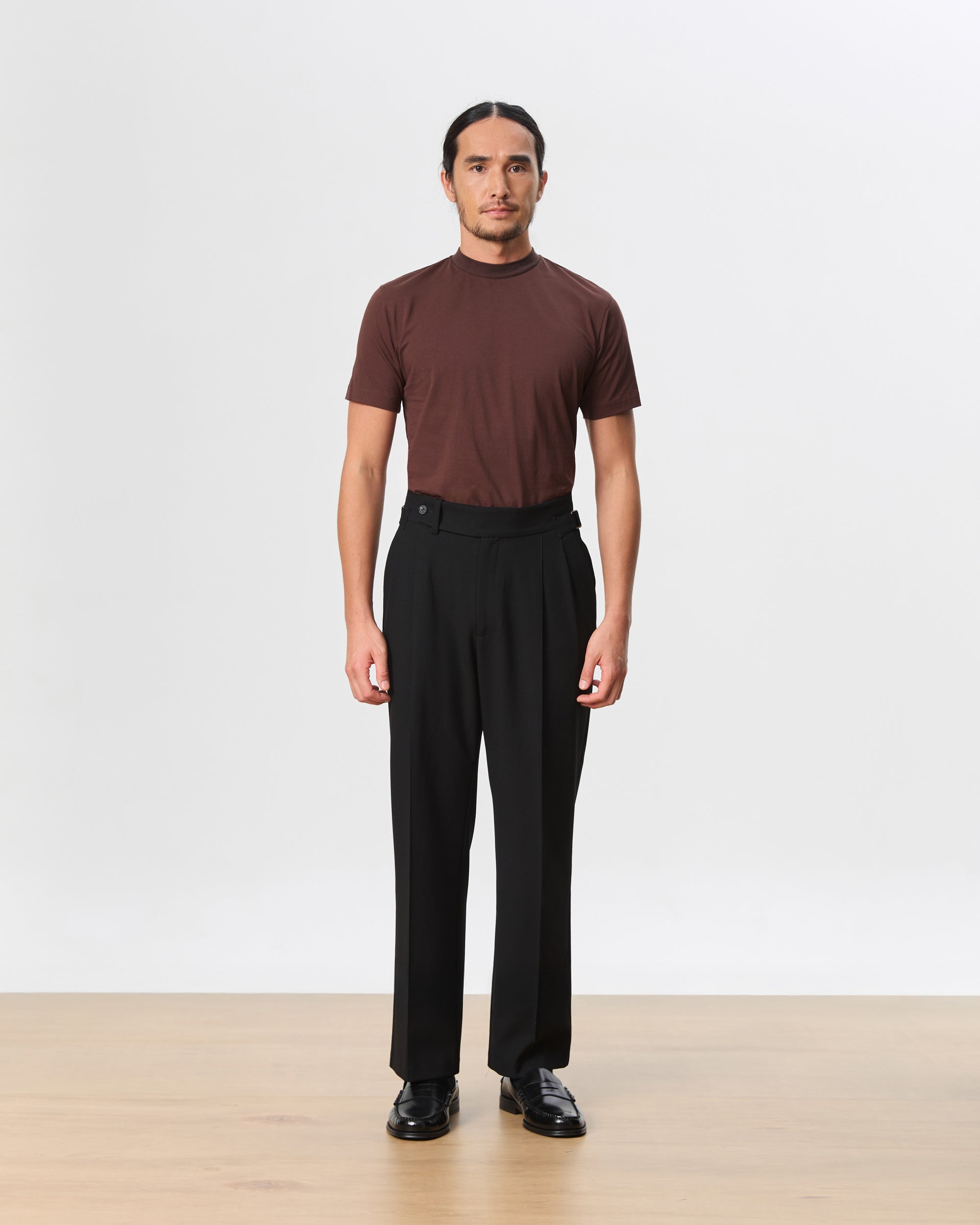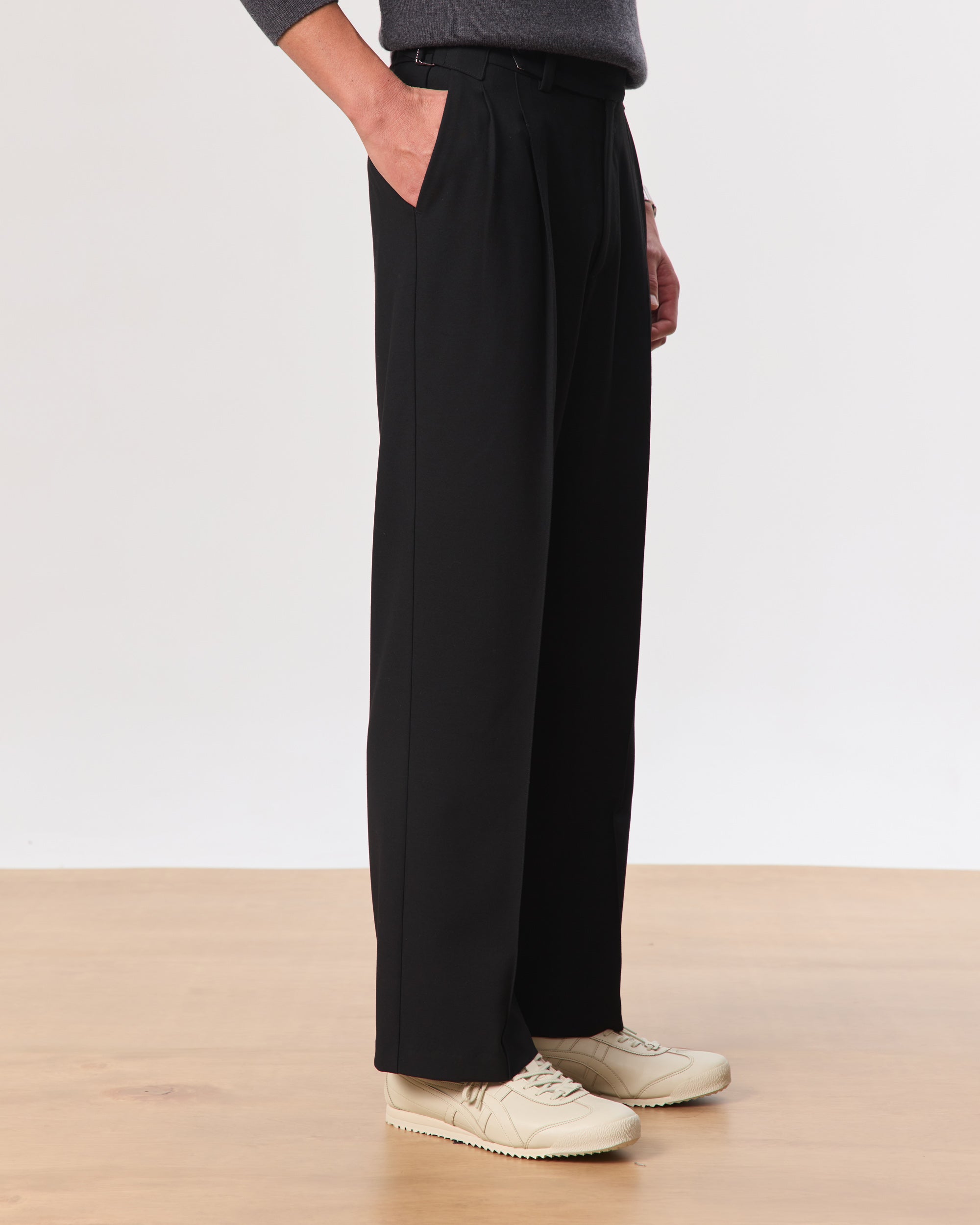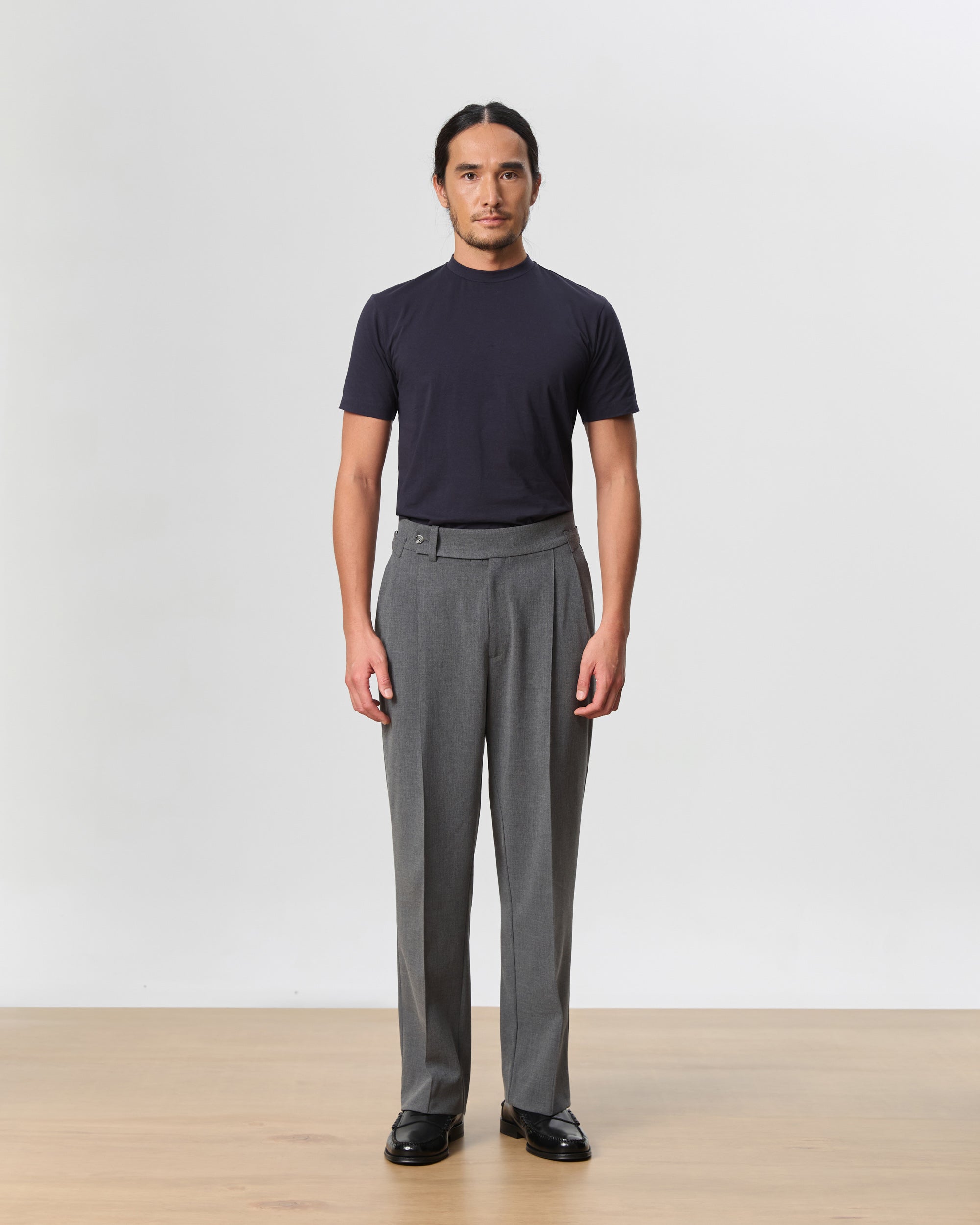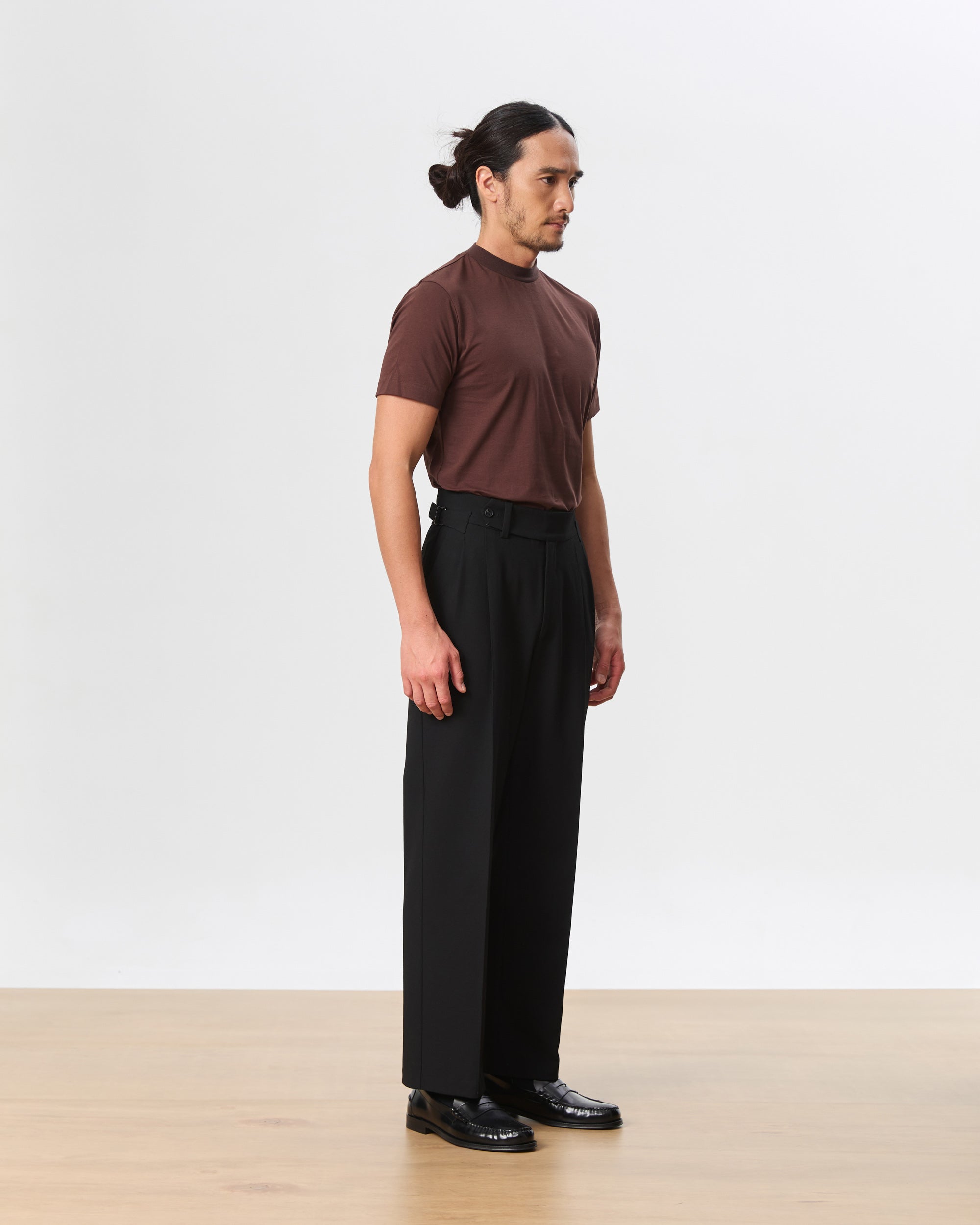 Tailored wide leg trousers in a soft, drapey wool-blend suiting. Designed with an extended tab closure and side adjusters for a clean, adaptable fit. Reverse pleats and a pintuck detail lend sharpness to its relaxed silhouette. An elegant essential that moves fluidly with you; equally suited for dressed-up ease or refined everyday wear.