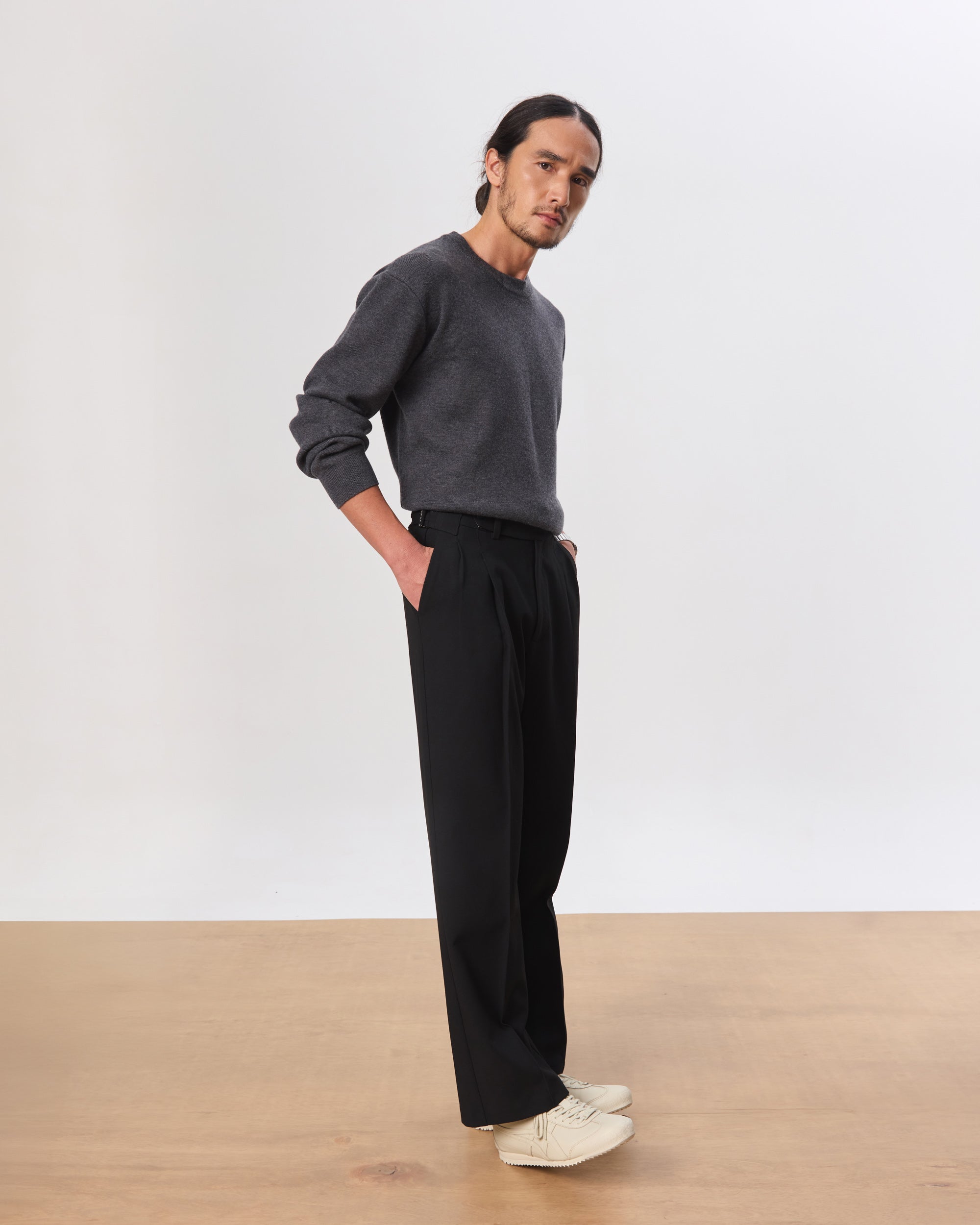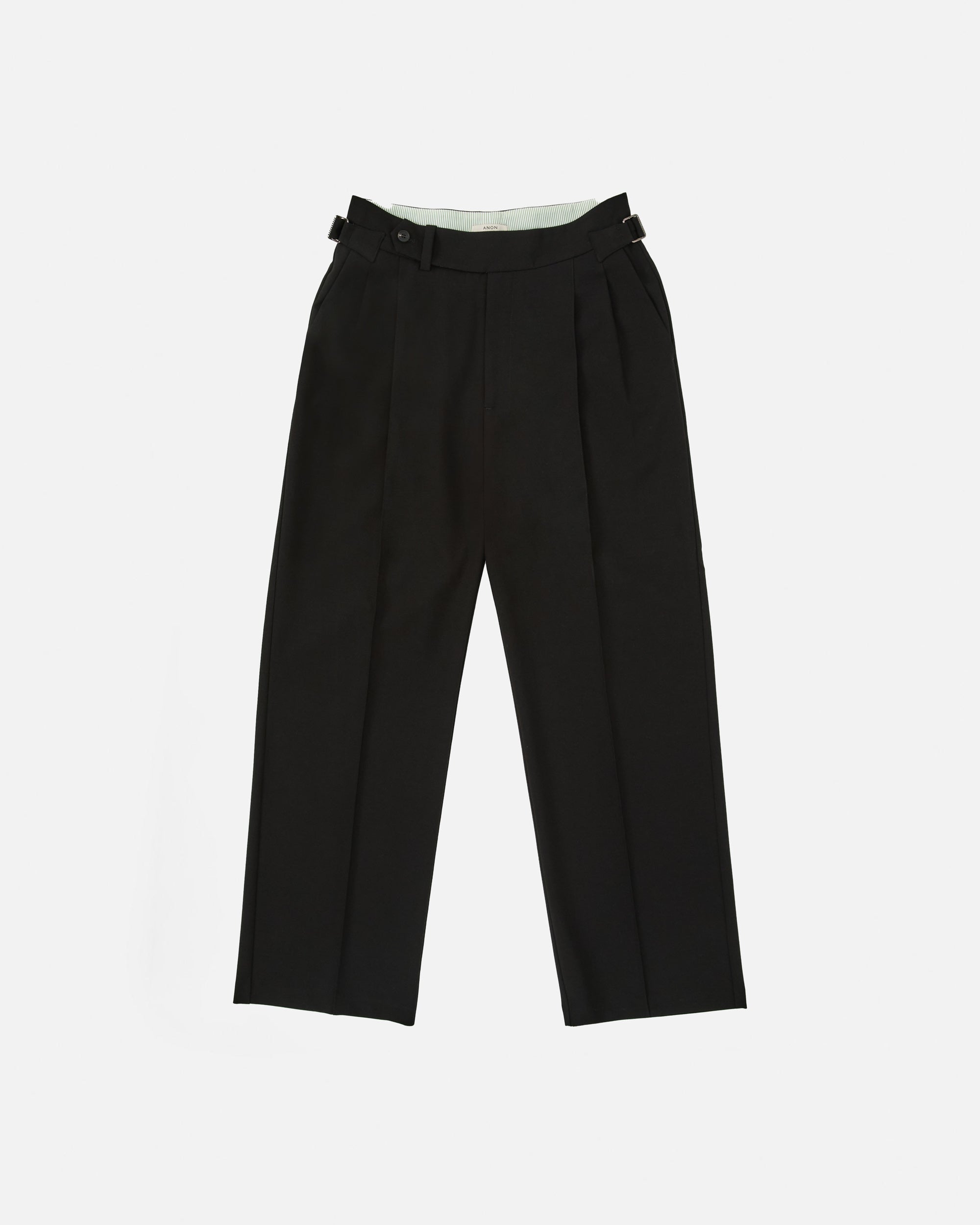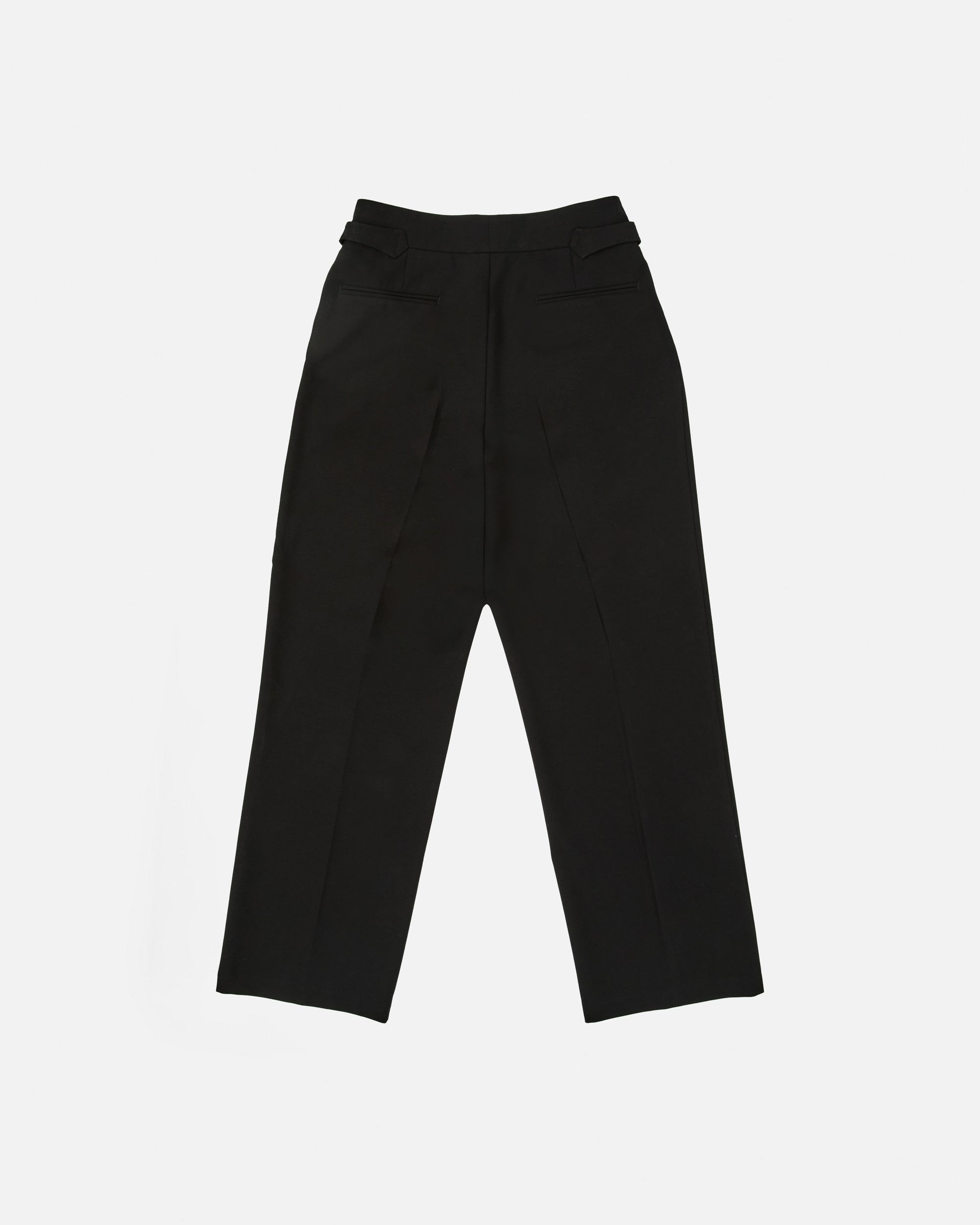 Tailored wide leg trousers in a soft, drapey wool-blend suiting. Designed with an extended tab closure and side adjusters for a clean, adaptable fit. Reverse pleats and a pintuck detail lend sharpness to its relaxed silhouette. An elegant essential that moves fluidly with you; equally suited for dressed-up ease or refined everyday wear.