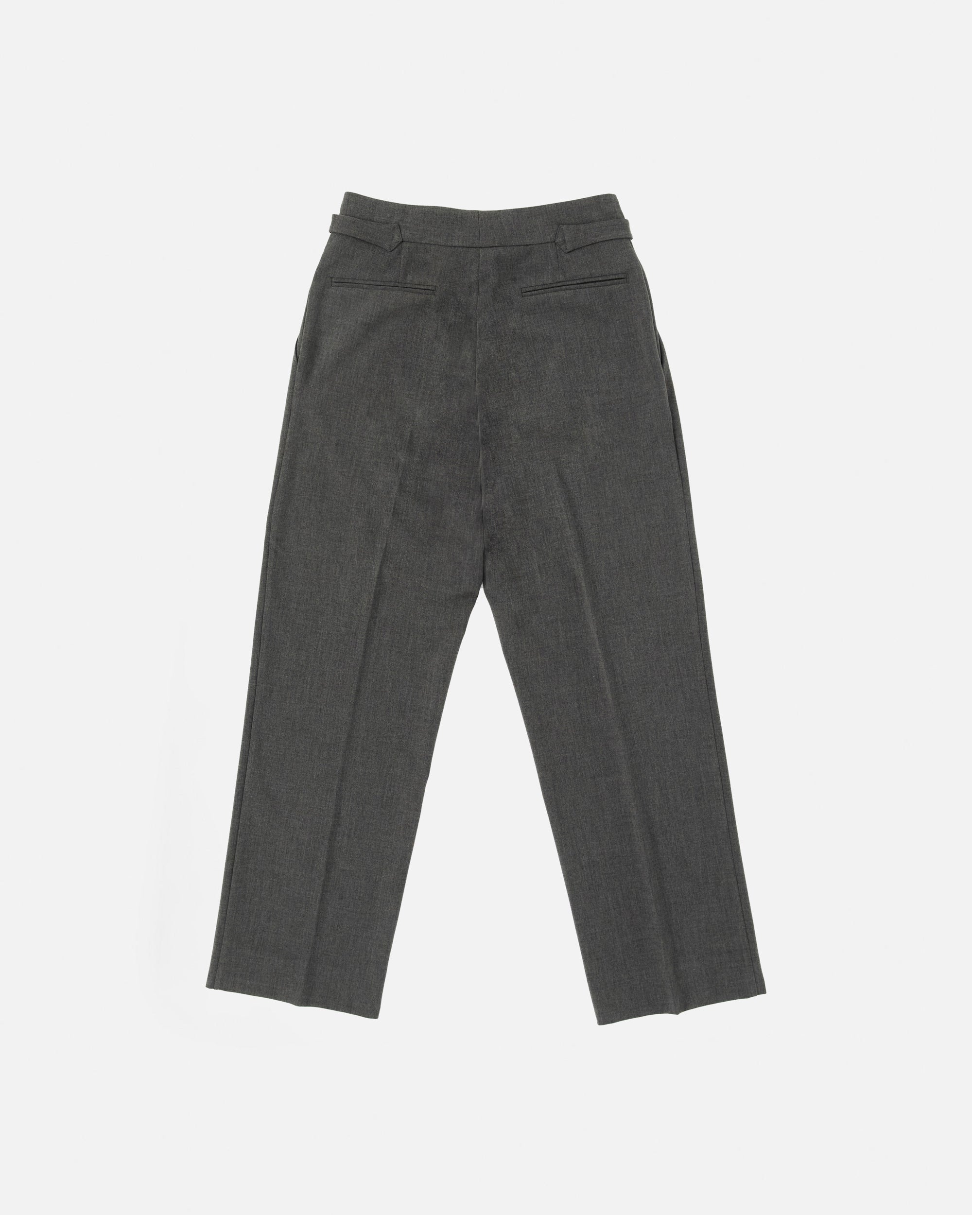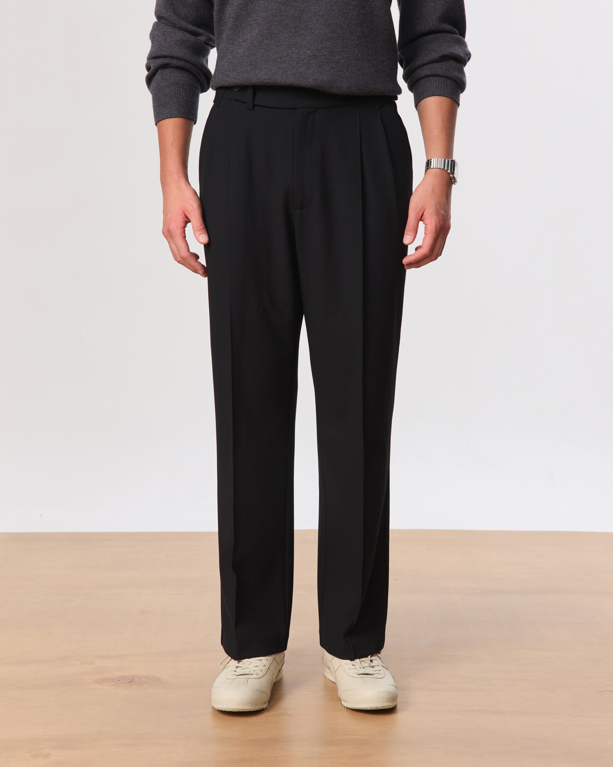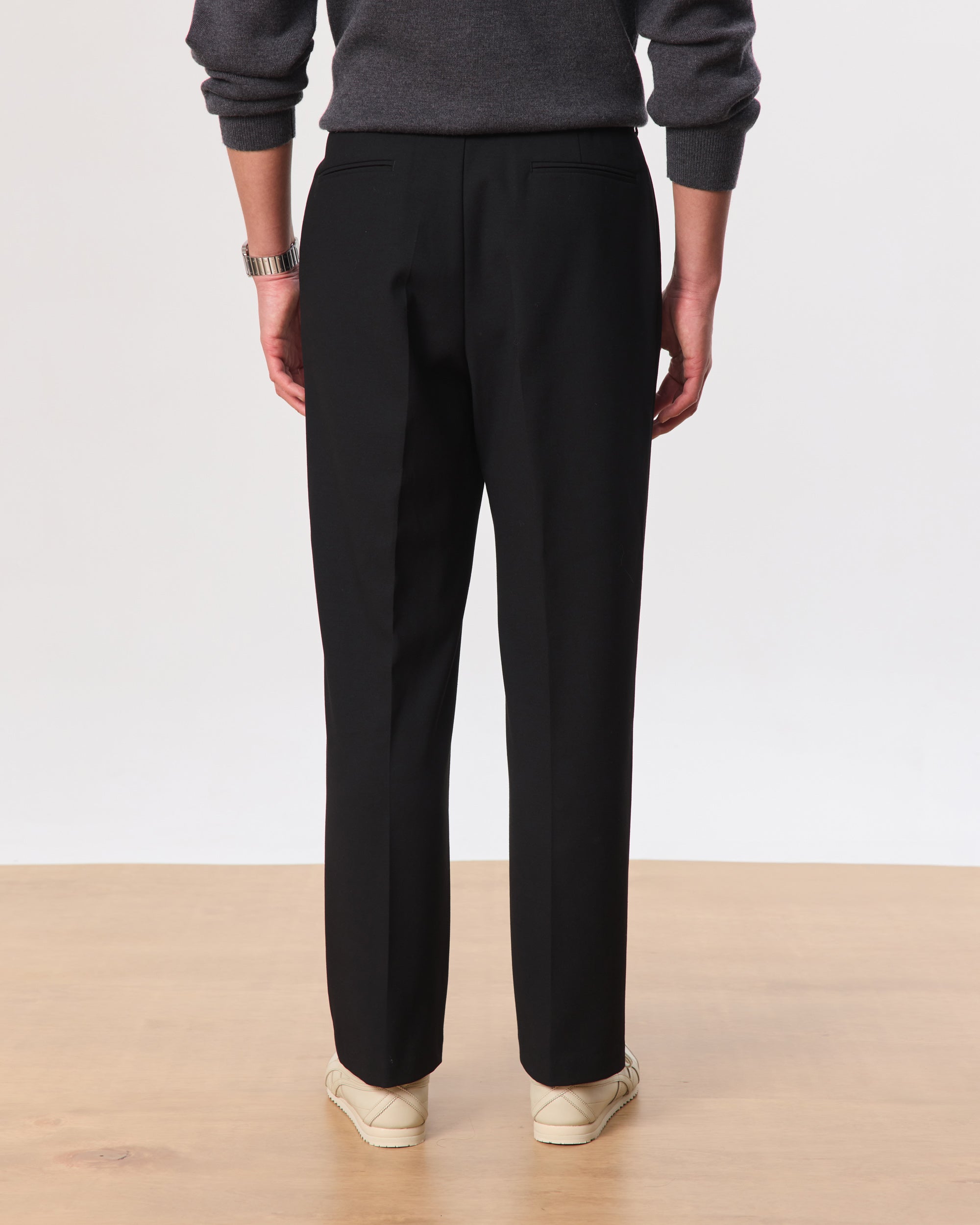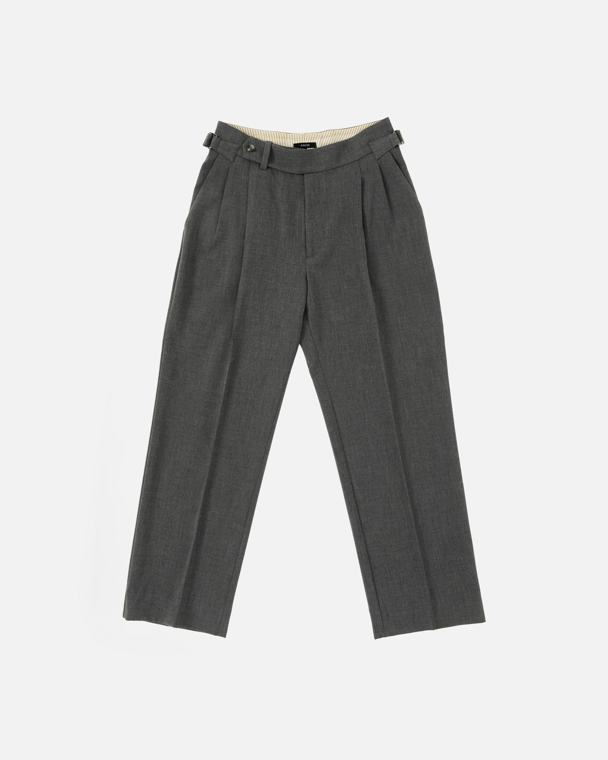 Tailored wide leg trousers in a soft, drapey wool-blend suiting. Designed with an extended tab closure and side adjusters for a clean, adaptable fit. Reverse pleats and a pintuck detail lend sharpness to its relaxed silhouette. An elegant essential that moves fluidly with you; equally suited for dressed-up ease or refined everyday wear.