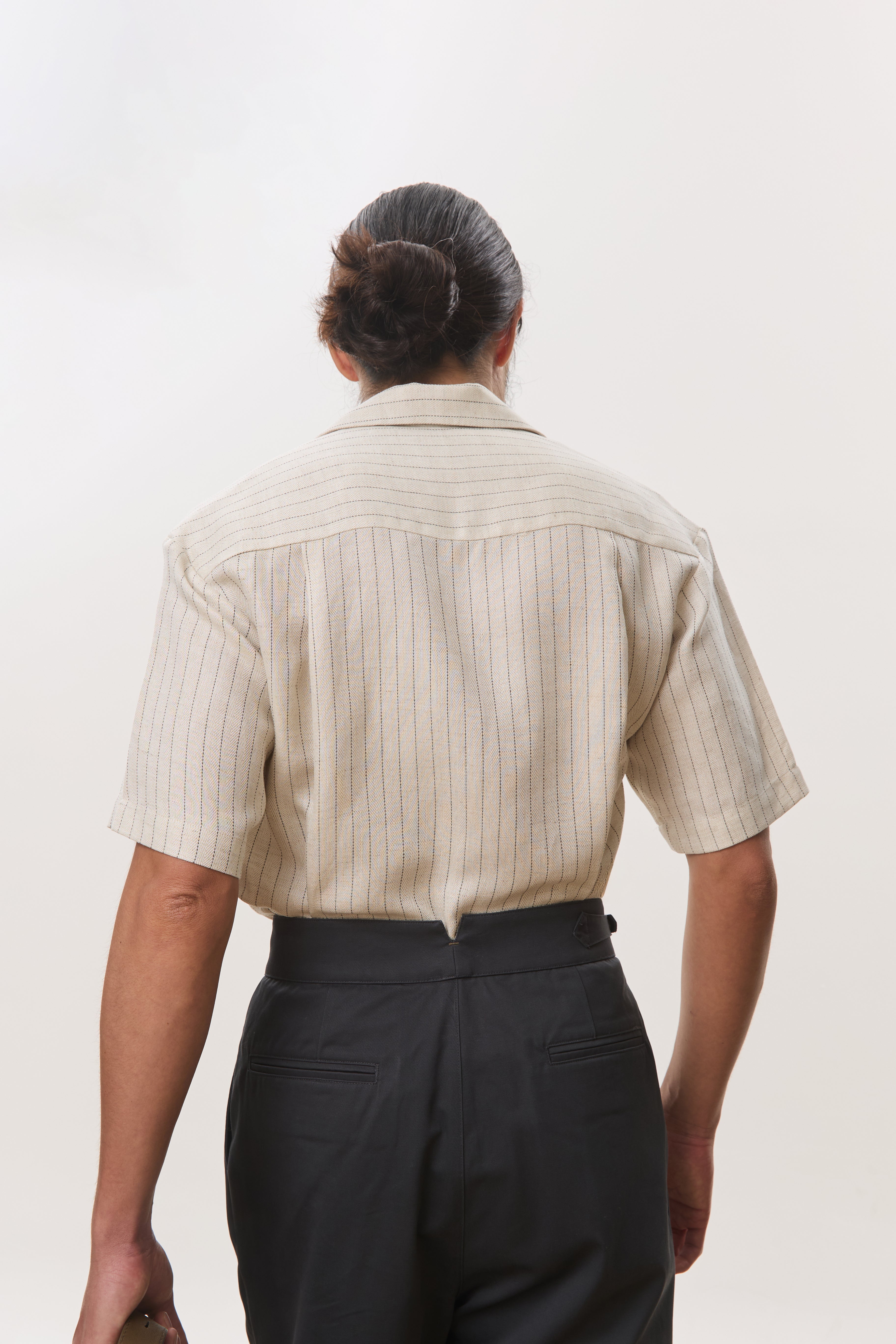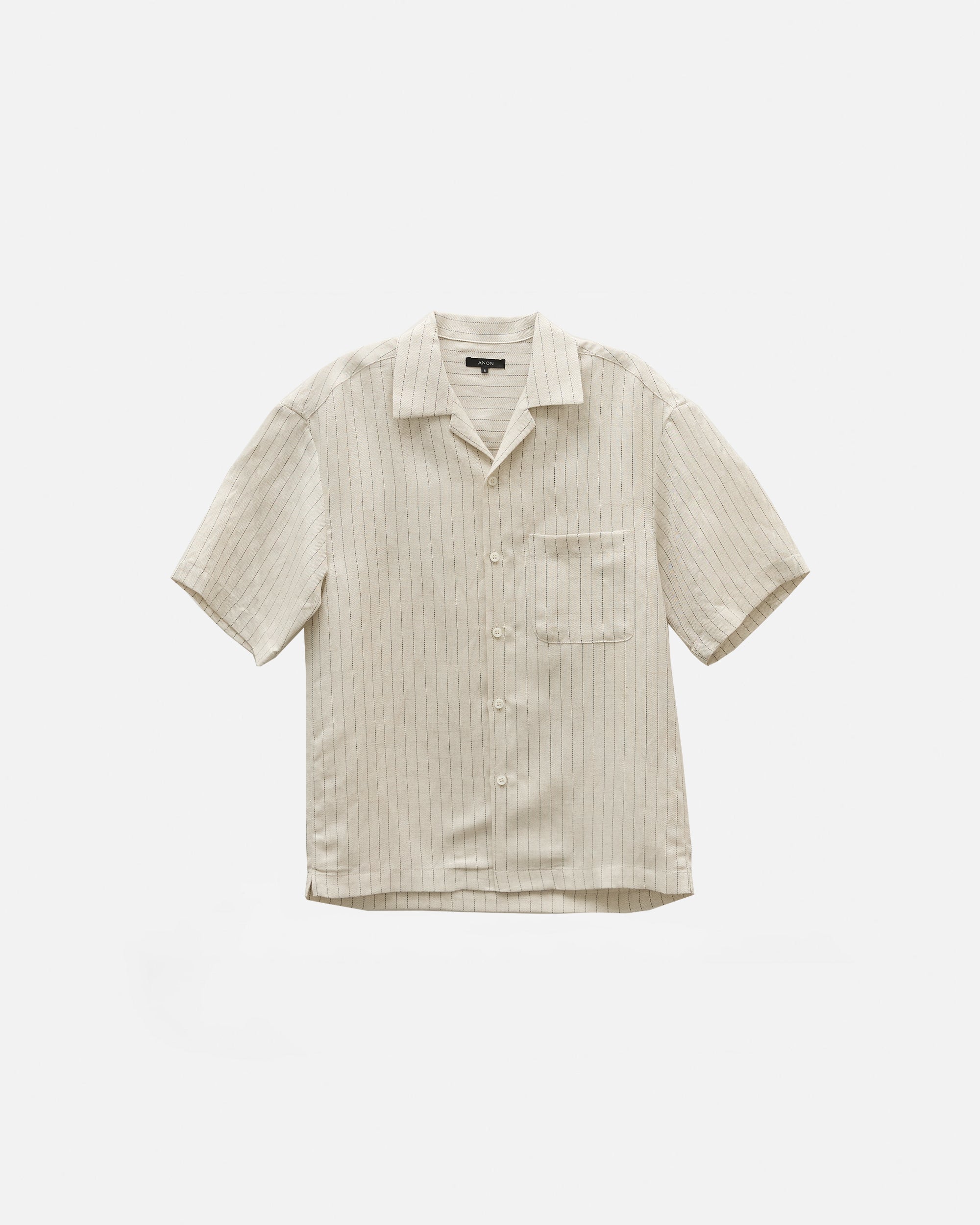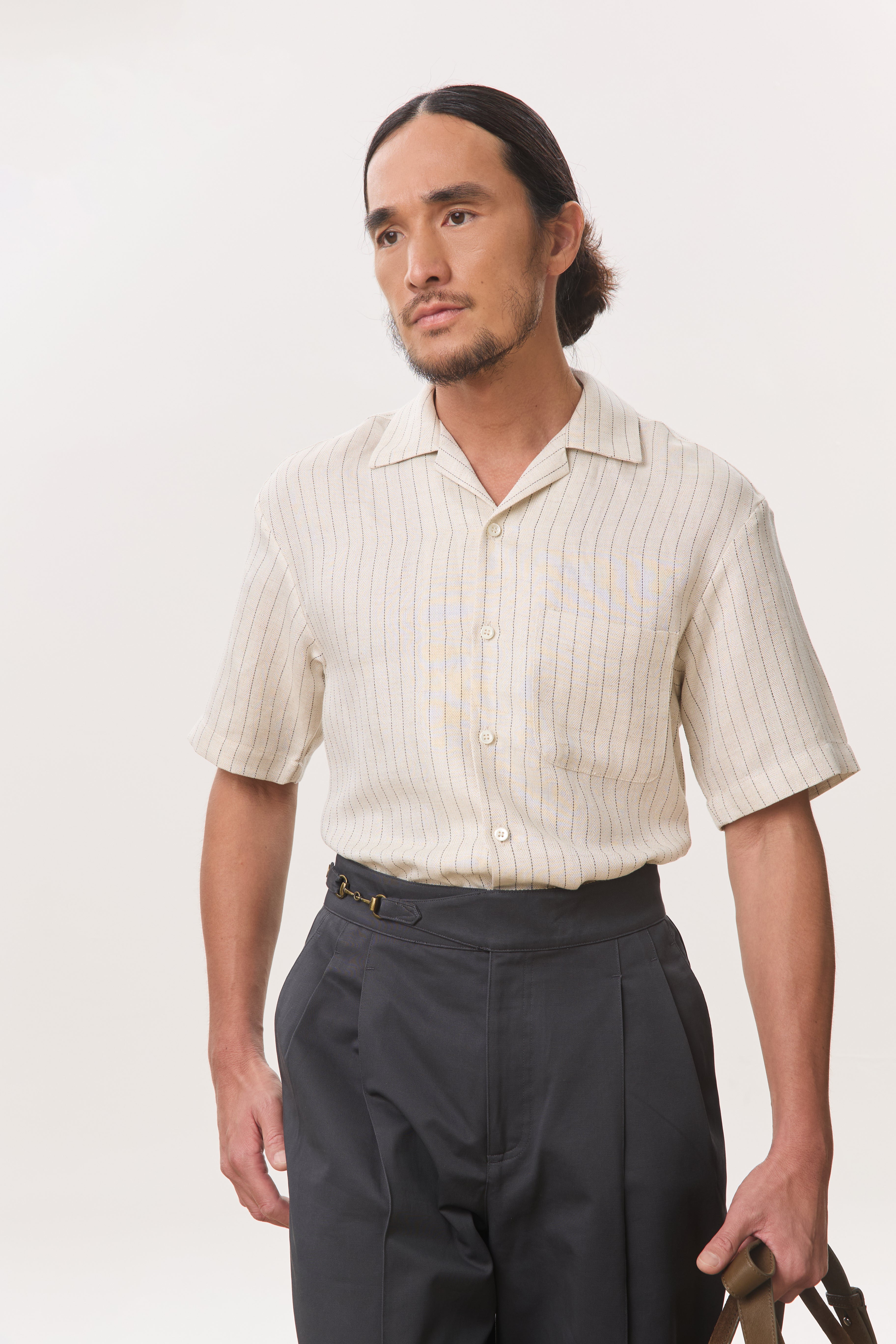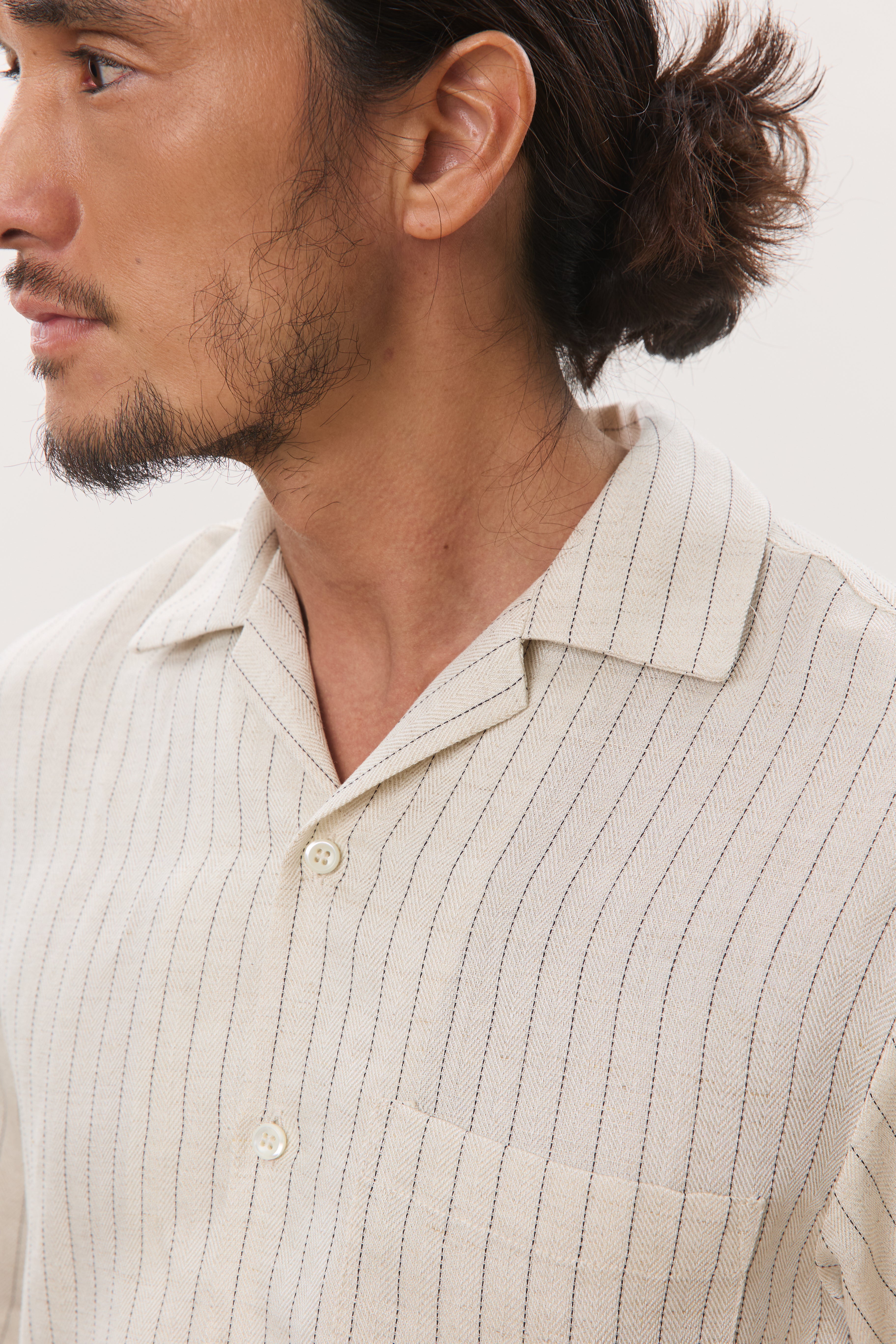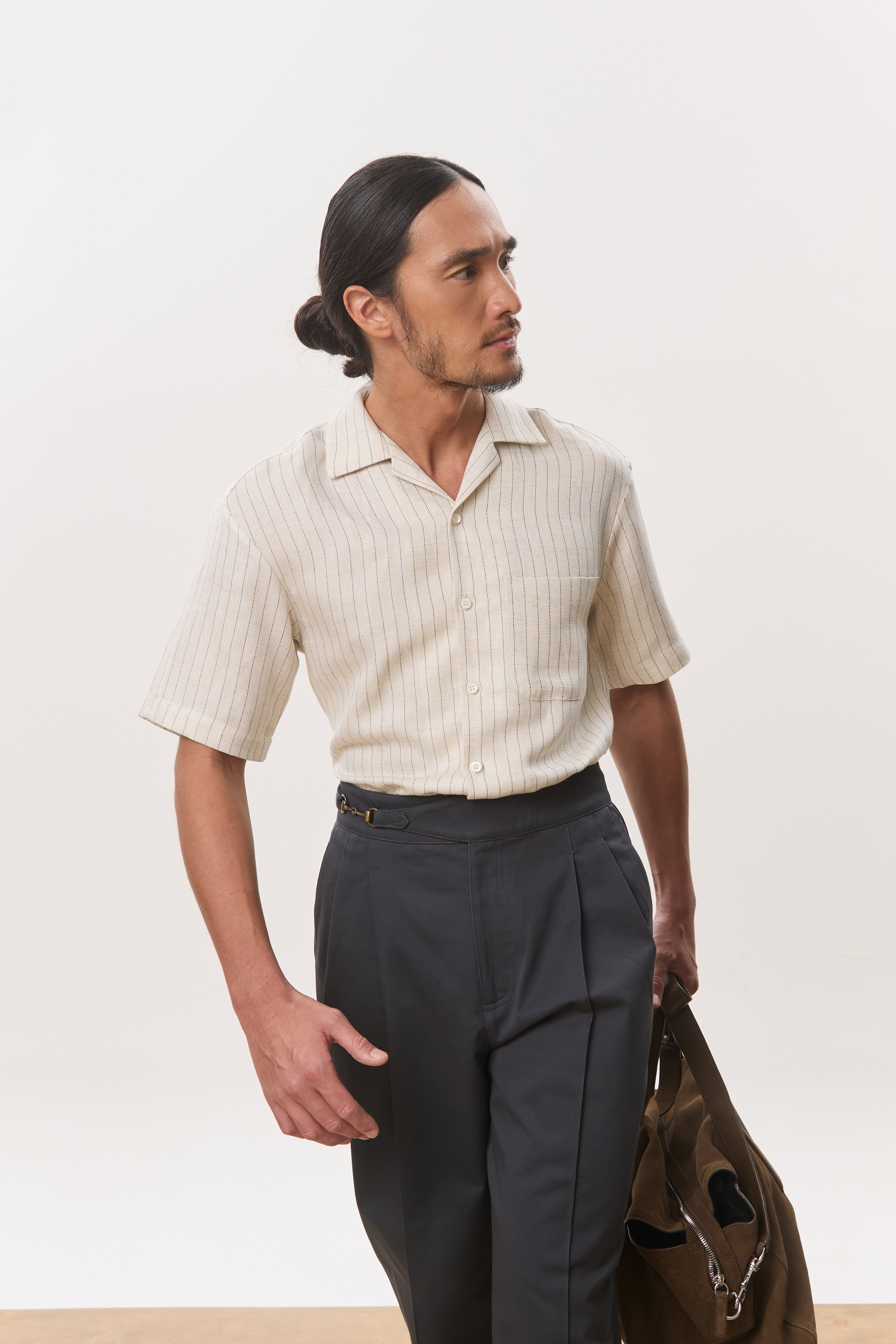 Cut from a breathable 180gsm hemp–rayon blend (45% linen, 55% rayon), this camp collar short sleeve shirt balances natural texture with a soft, fluid drape. Designed with a relaxed yet considered silhouette, it features an open camp collar, clean button placket, subtle chest pocket, and a split hem that allows the shirt to be worn comfortably tucked or untucked. The vertical stripe adds quiet visual interest while remaining versatile and understated, making it an easy choice for warm, humid days. Lightweight, breathable, and effortless, this is a refined everyday staple that transitions seamlessly from casual moments to more polished settings.