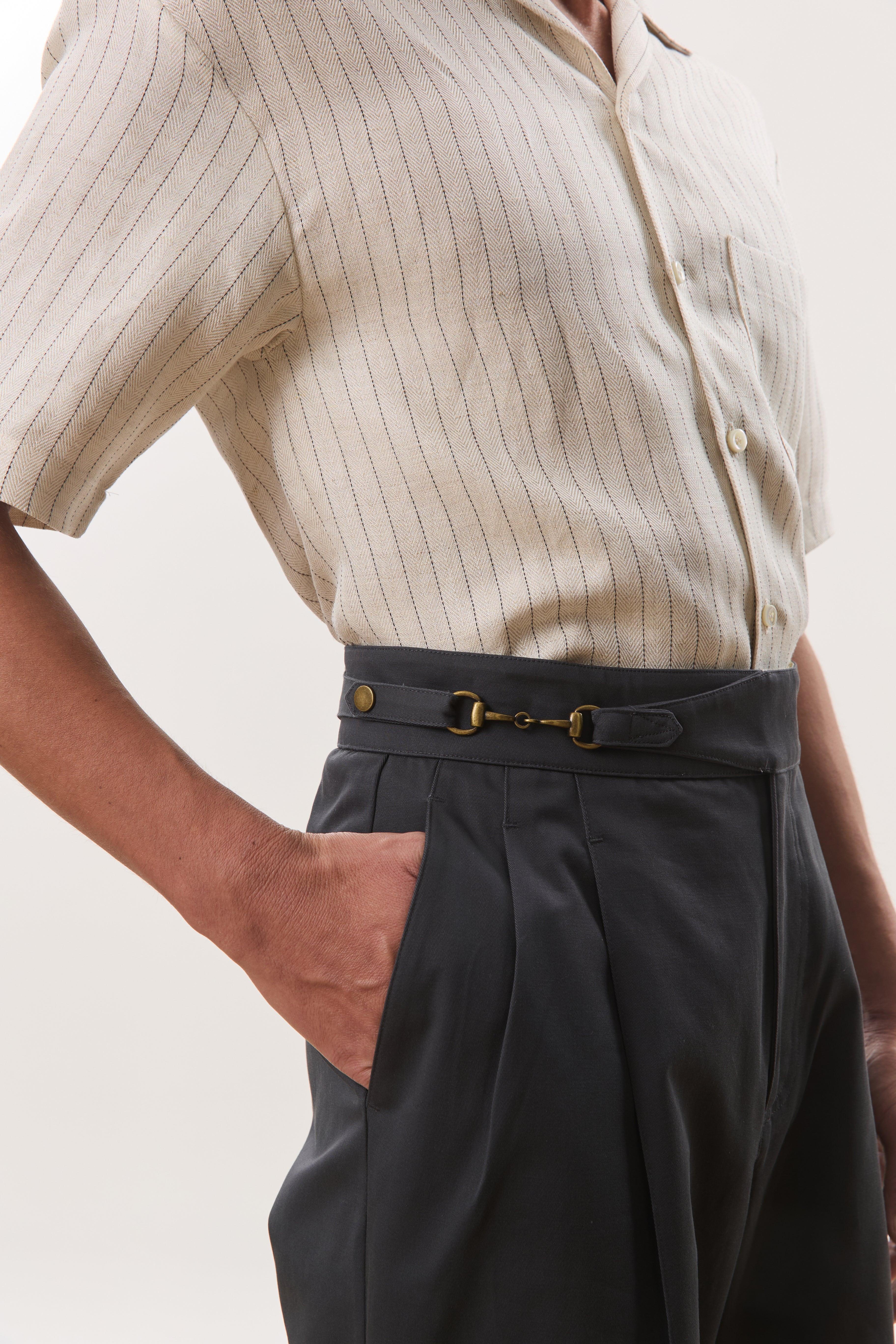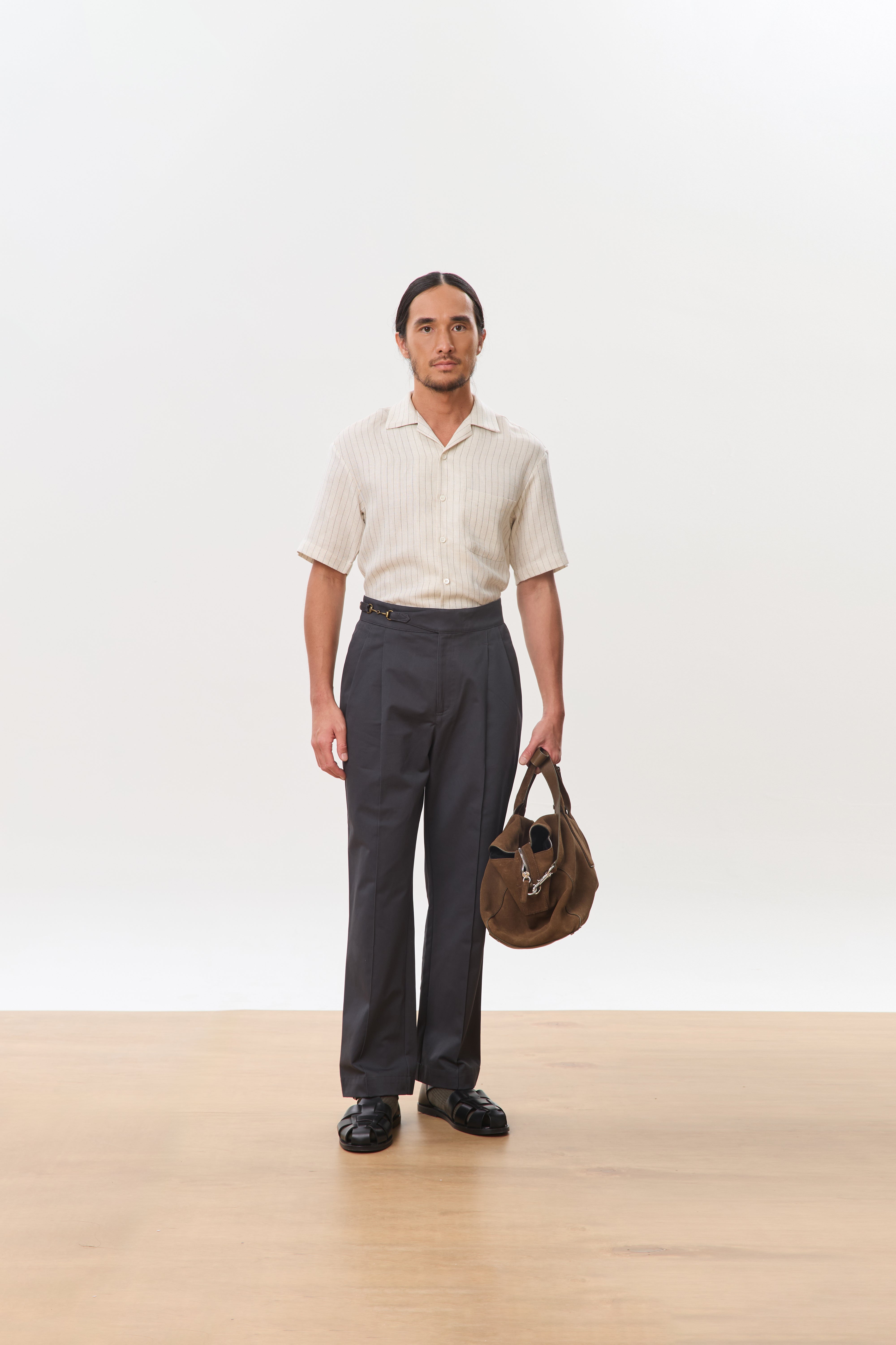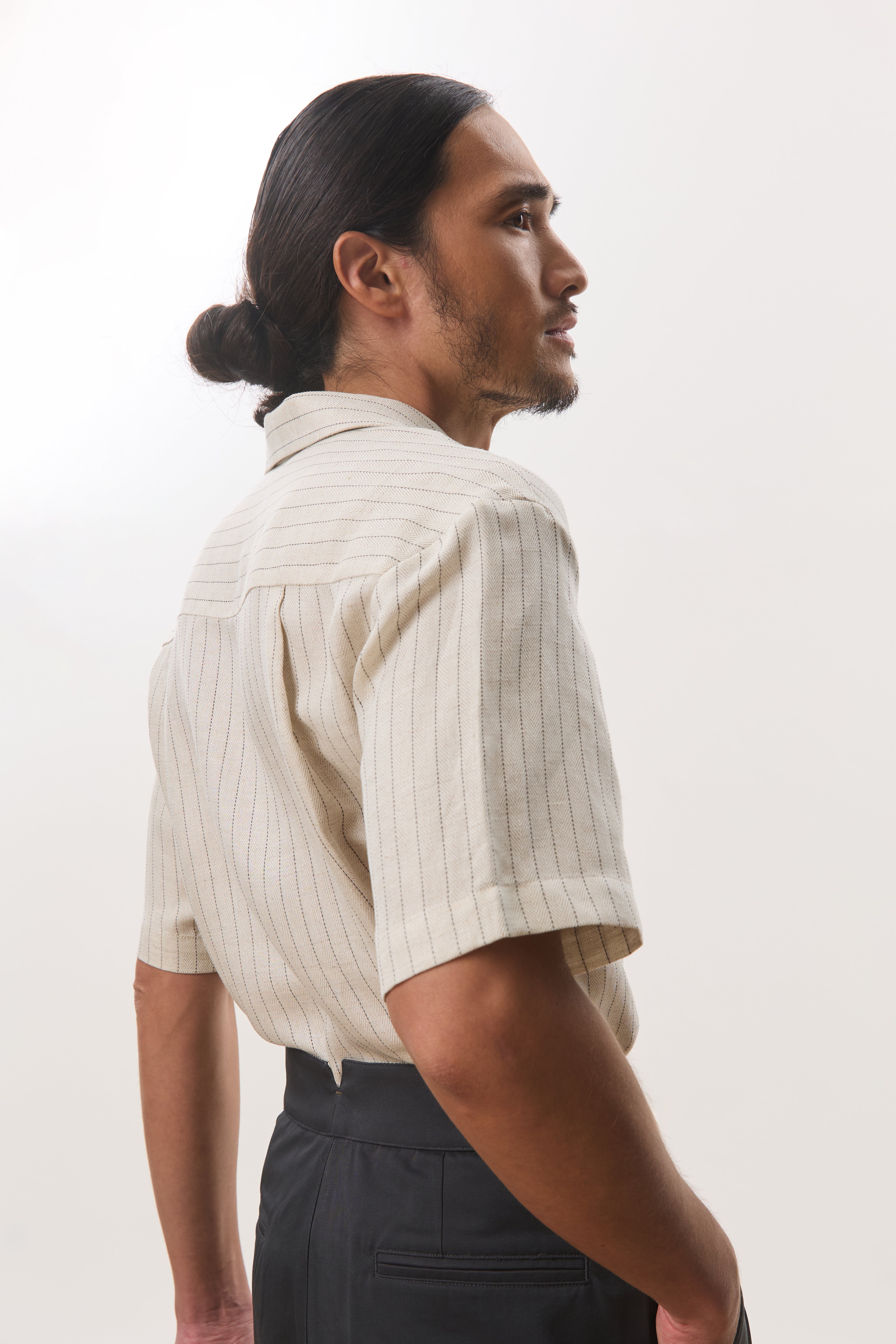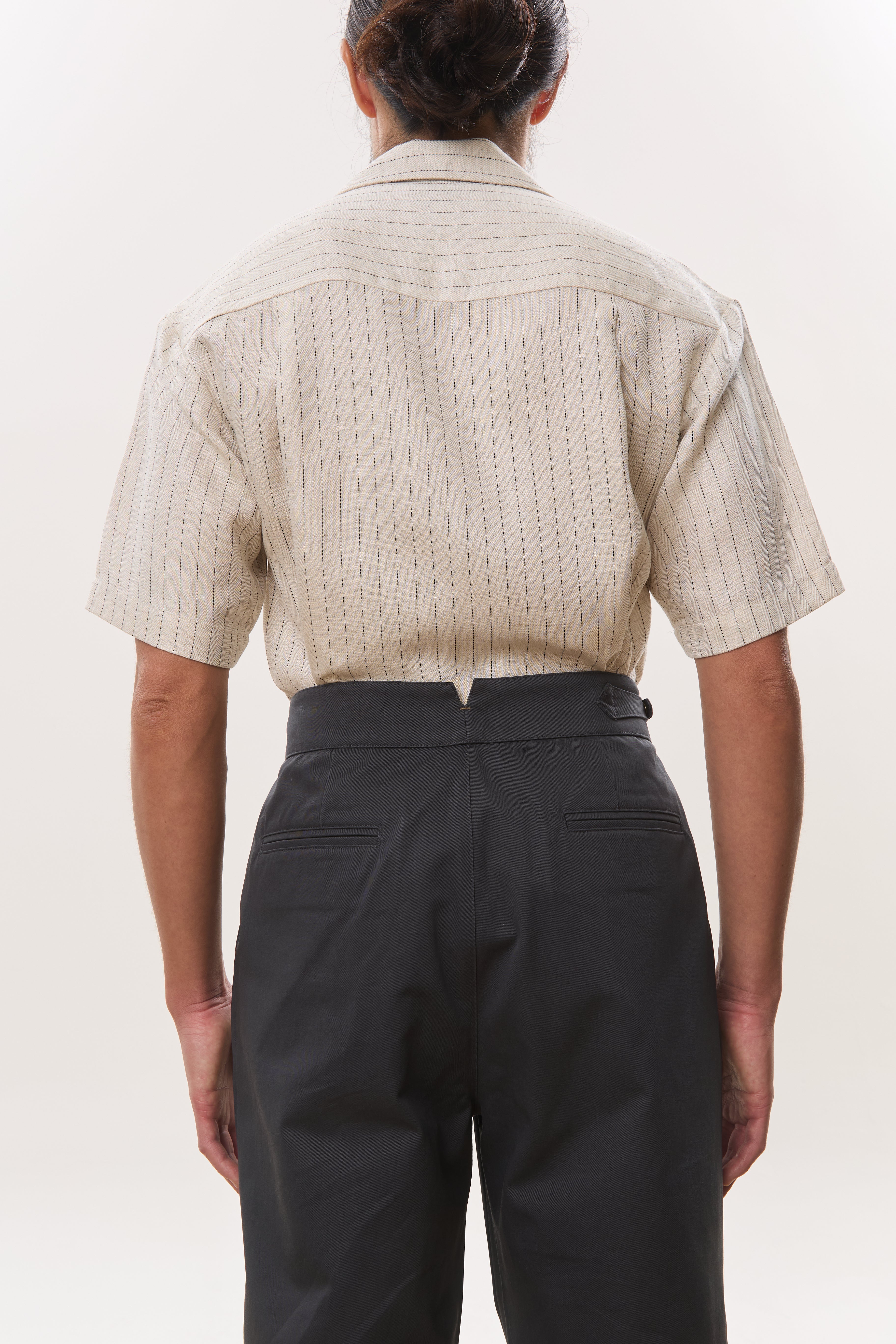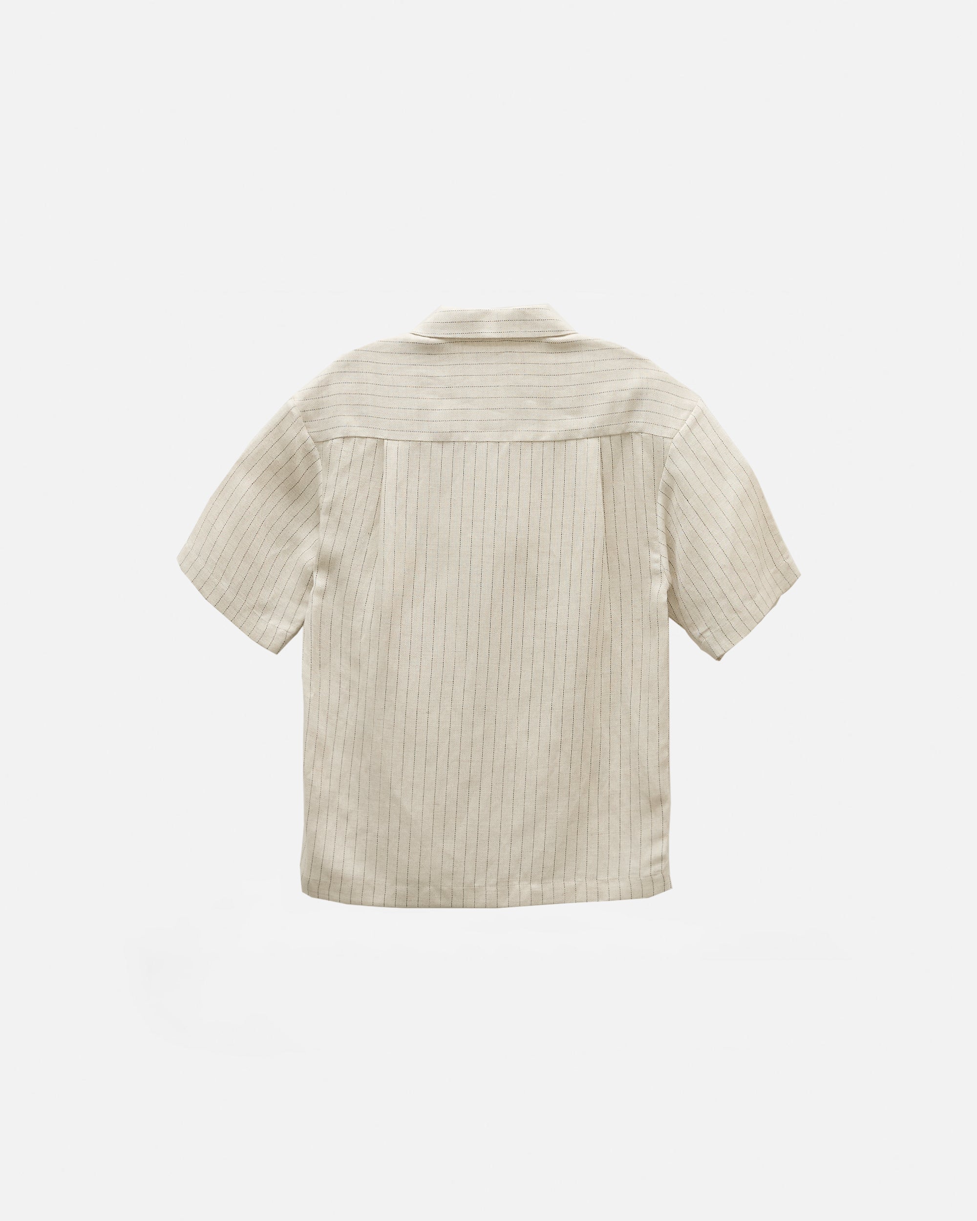 Cut from a breathable 180gsm hemp–rayon blend (45% linen, 55% rayon), this camp collar short sleeve shirt balances natural texture with a soft, fluid drape. Designed with a relaxed yet considered silhouette, it features an open camp collar, clean button placket, subtle chest pocket, and a split hem that allows the shirt to be worn comfortably tucked or untucked. The vertical stripe adds quiet visual interest while remaining versatile and understated, making it an easy choice for warm, humid days. Lightweight, breathable, and effortless, this is a refined everyday staple that transitions seamlessly from casual moments to more polished settings.