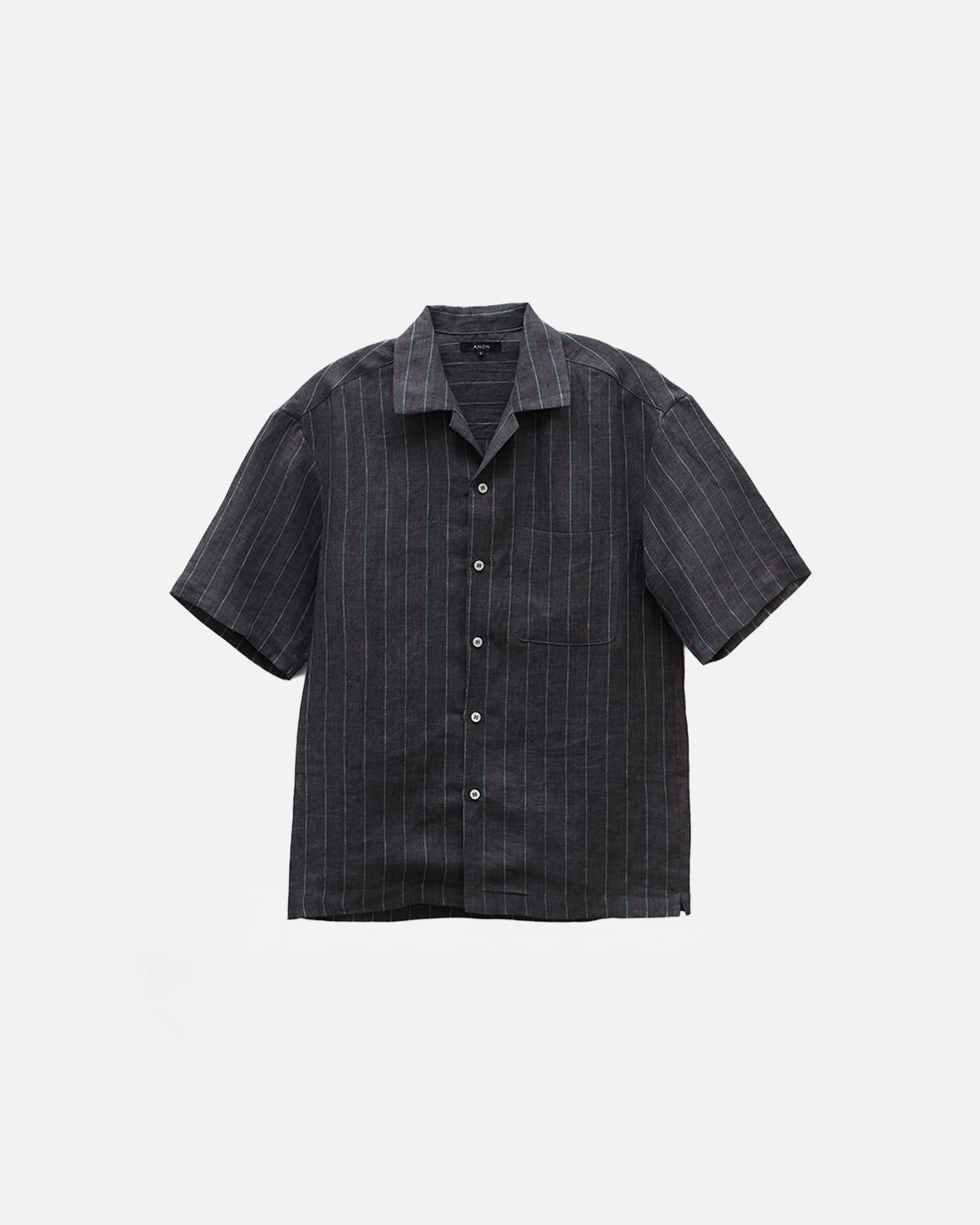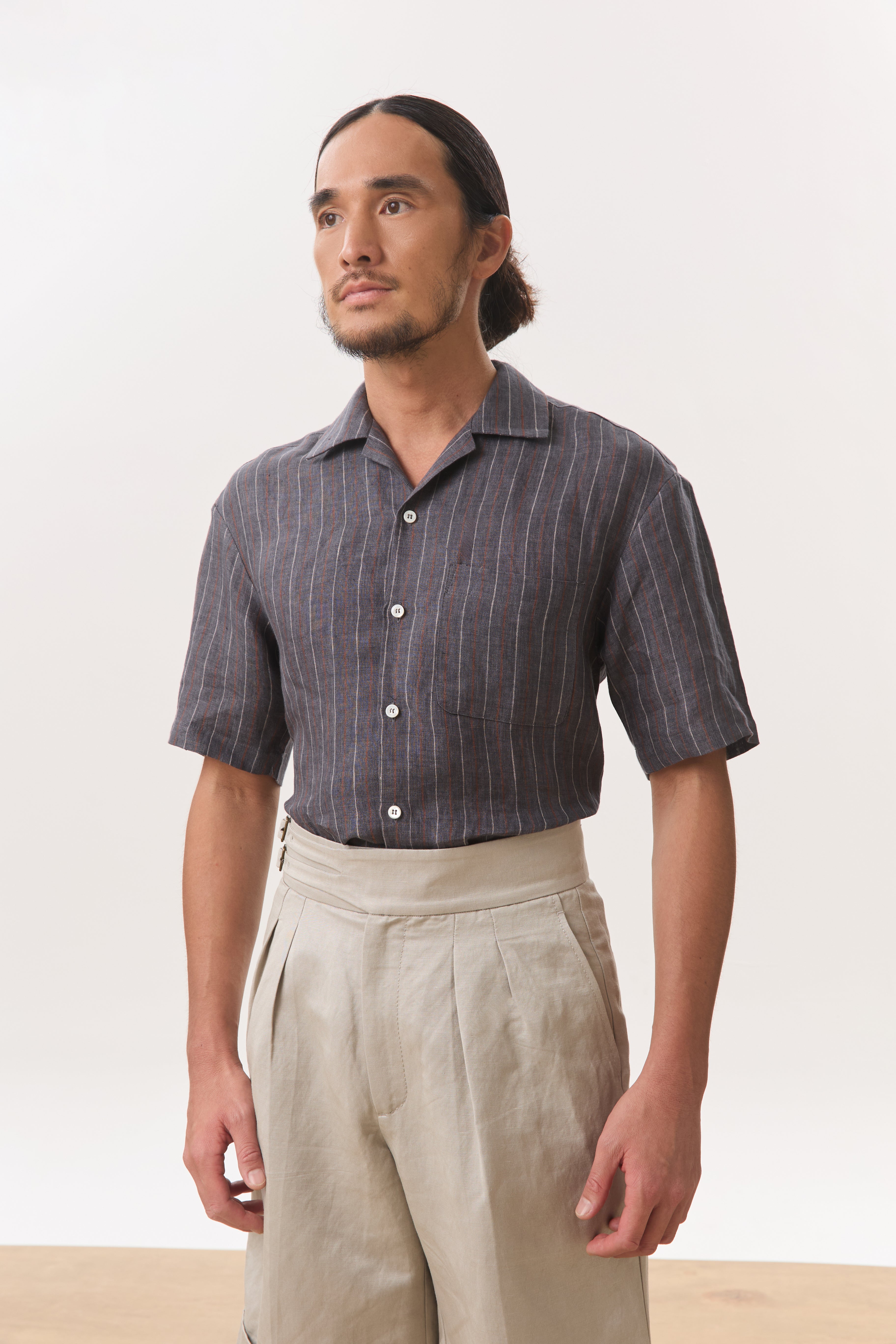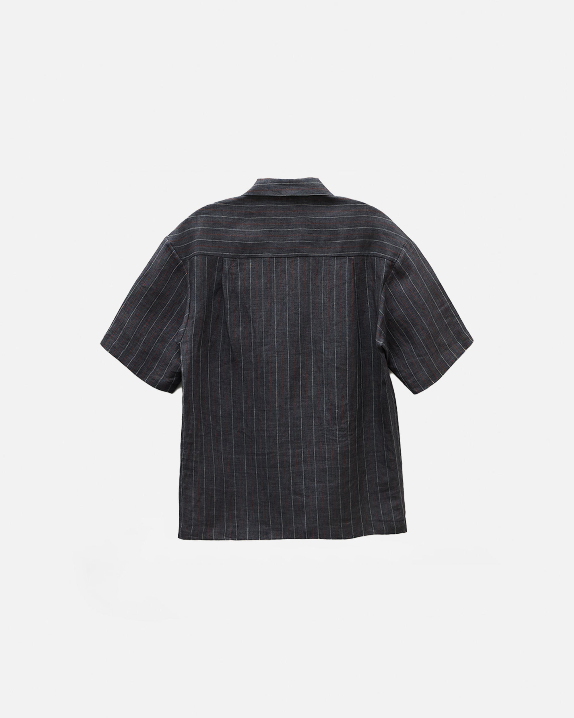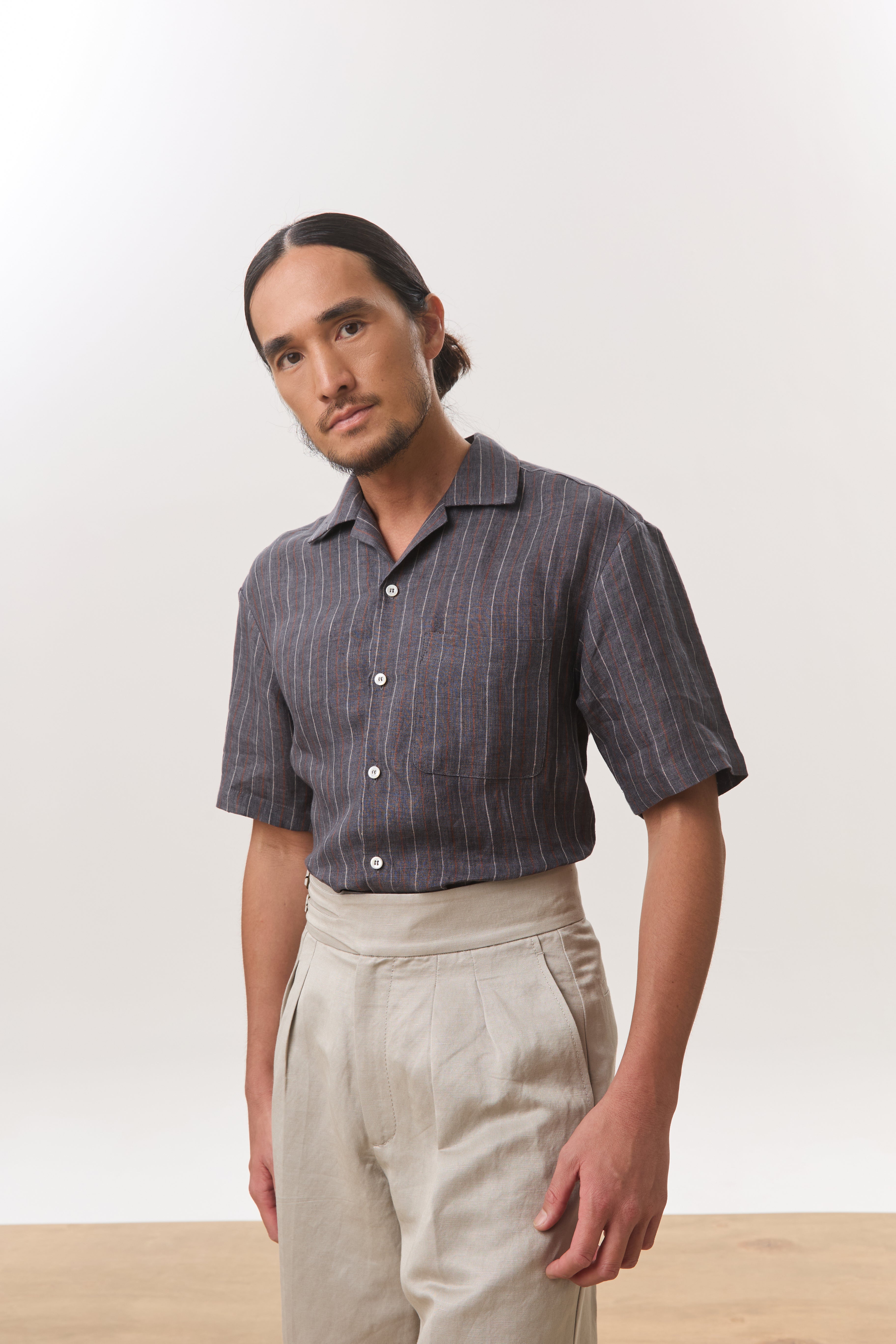 Cut from a breathable 140gsm hemp, this camp collar short sleeve shirt balances natural texture with a lightly structured drape. Designed with a relaxed yet considered silhouette, it features an open camp collar, clean button placket, subtle chest pocket, and a split hem that allows the shirt to be worn comfortably tucked or untucked. The vertical stripe adds quiet visual interest while remaining versatile and understated, making it an easy choice for warm, humid days. Lightweight, breathable, and effortless, this is a refined everyday staple that transitions seamlessly from casual moments to more polished settings.