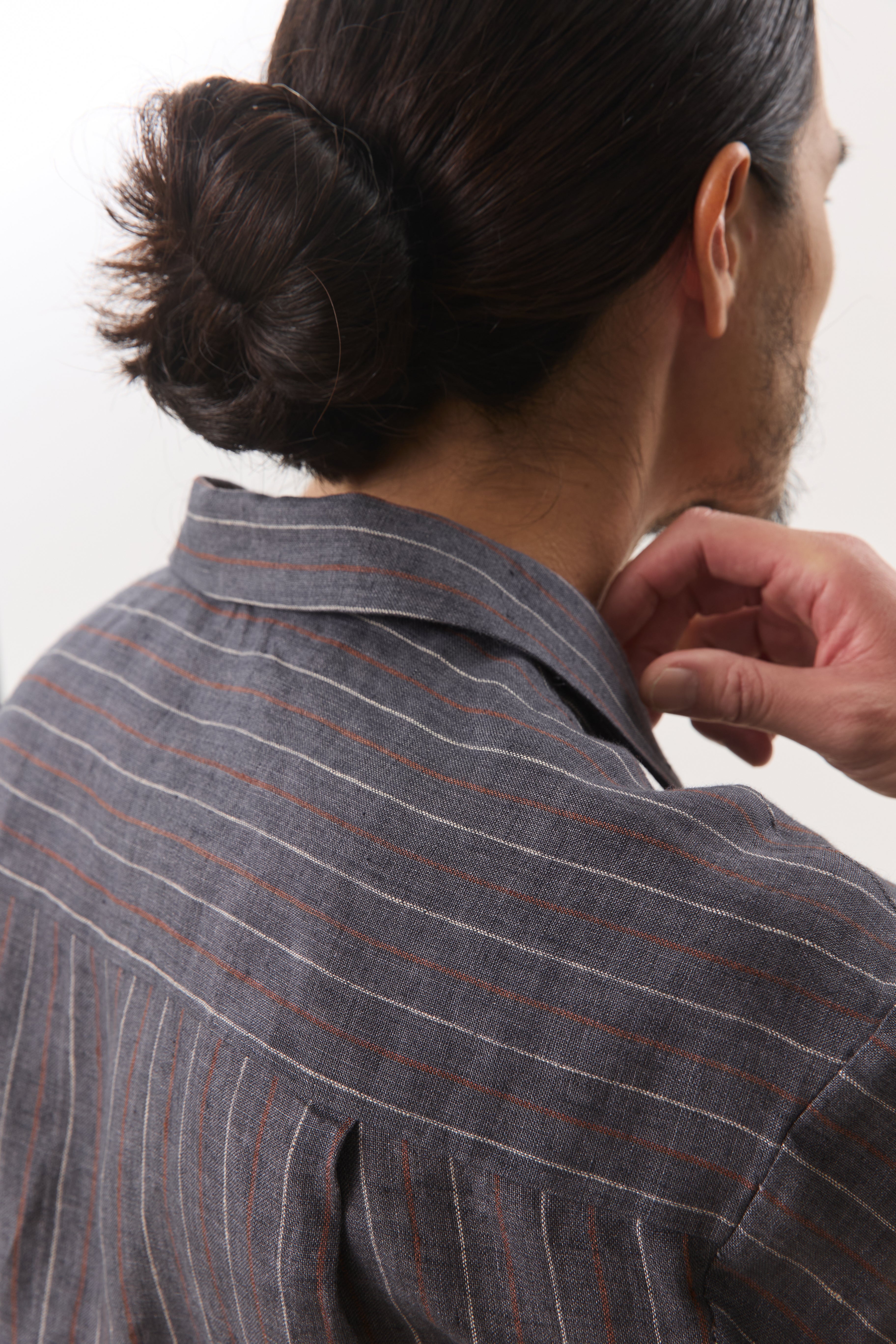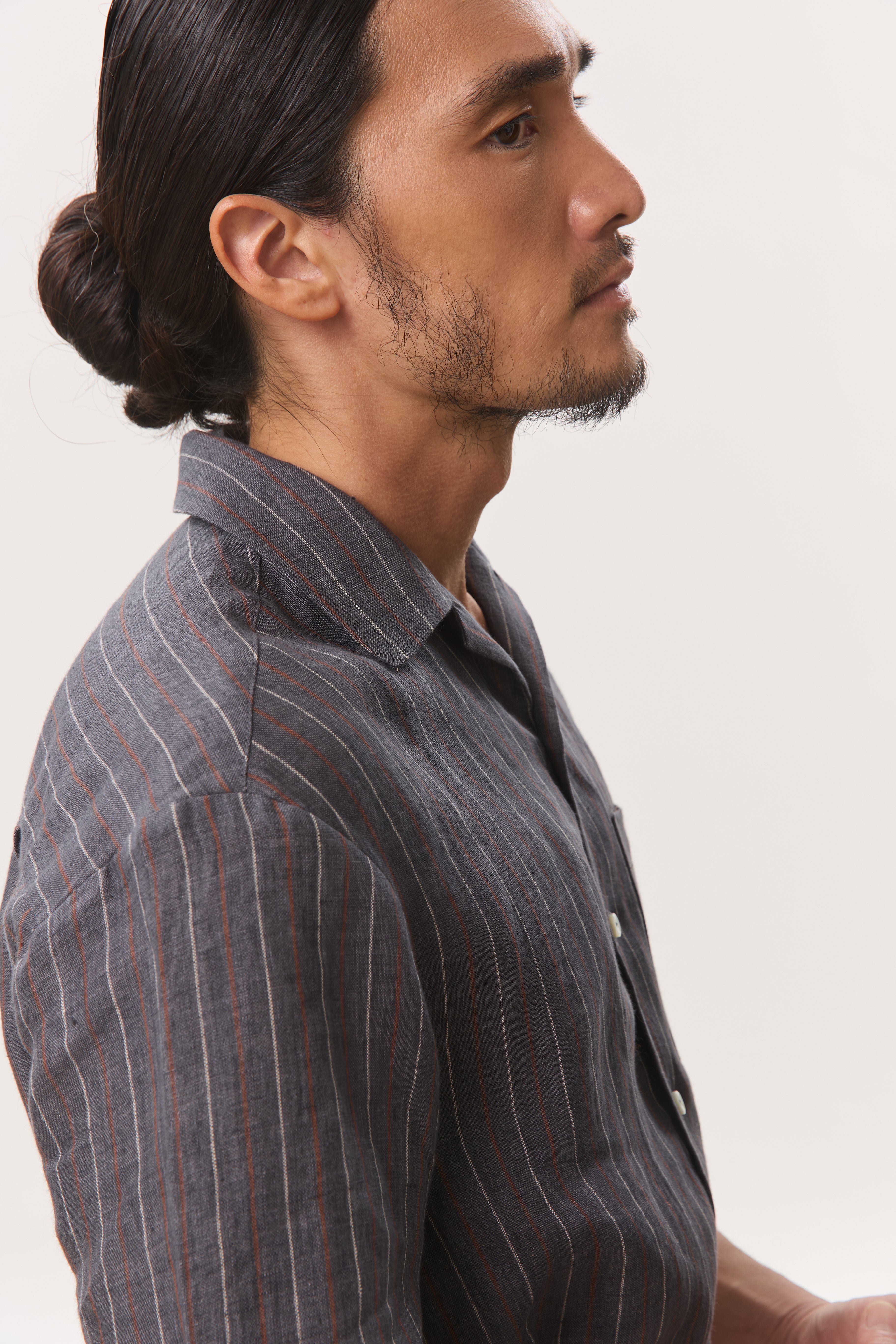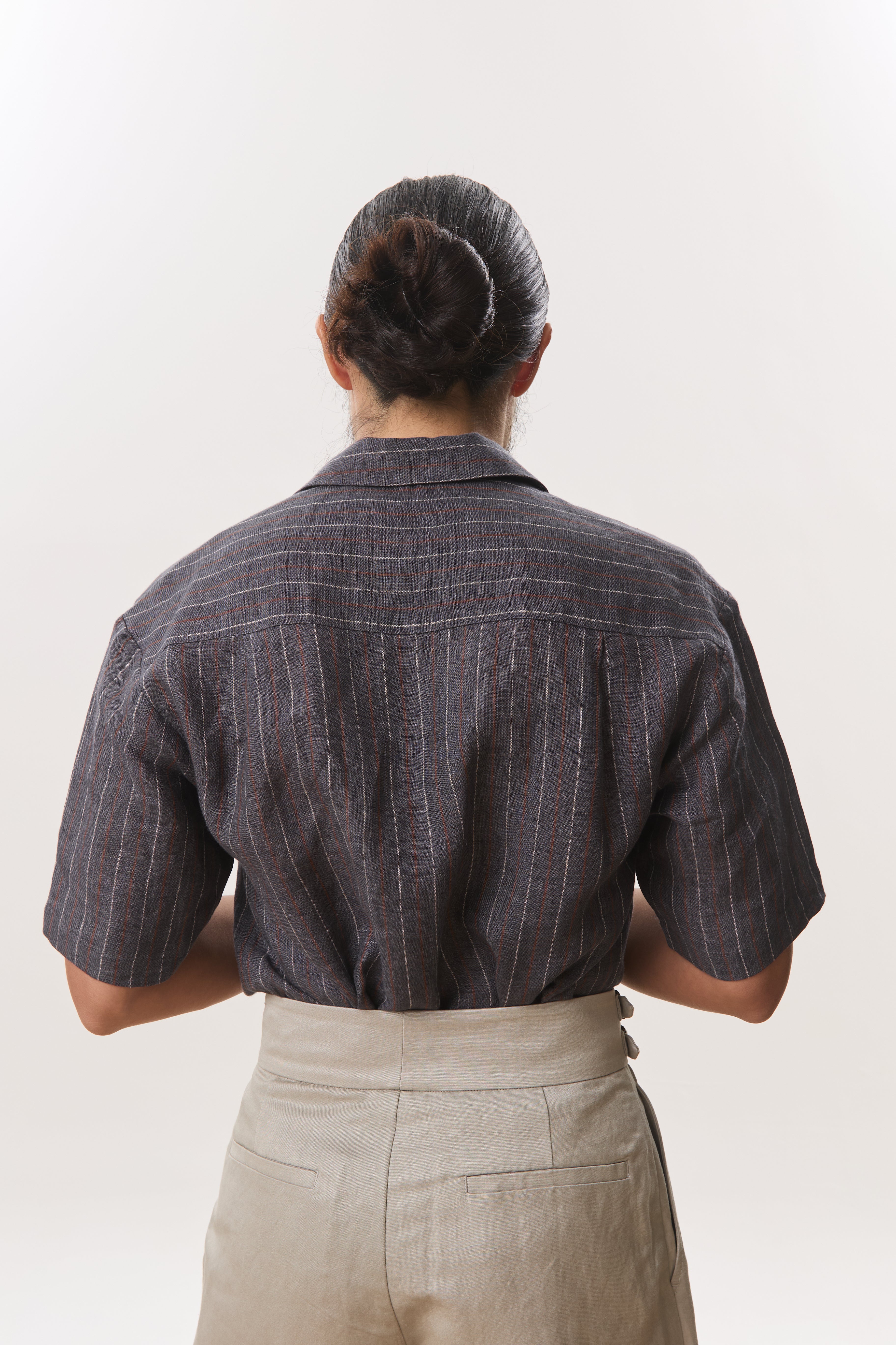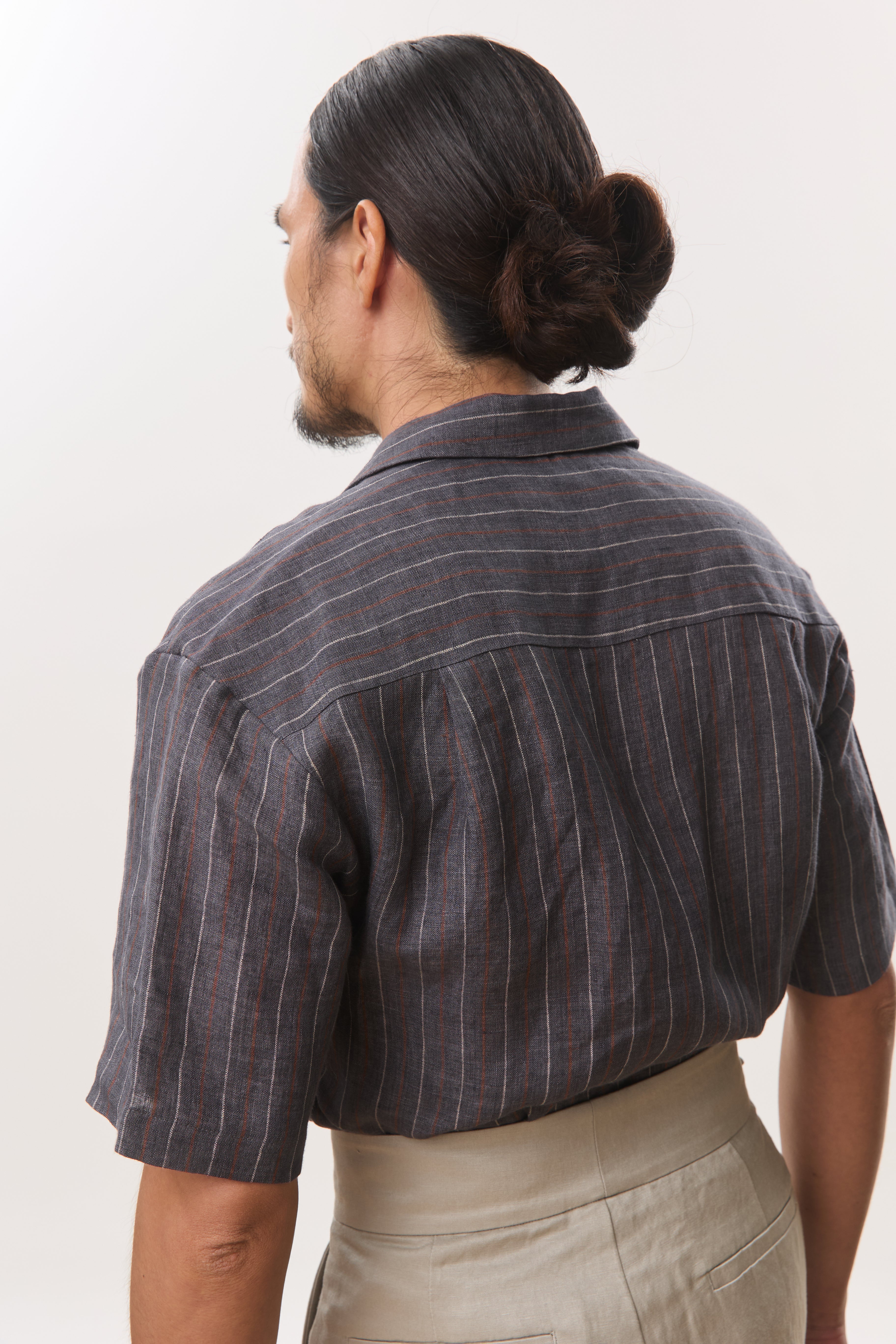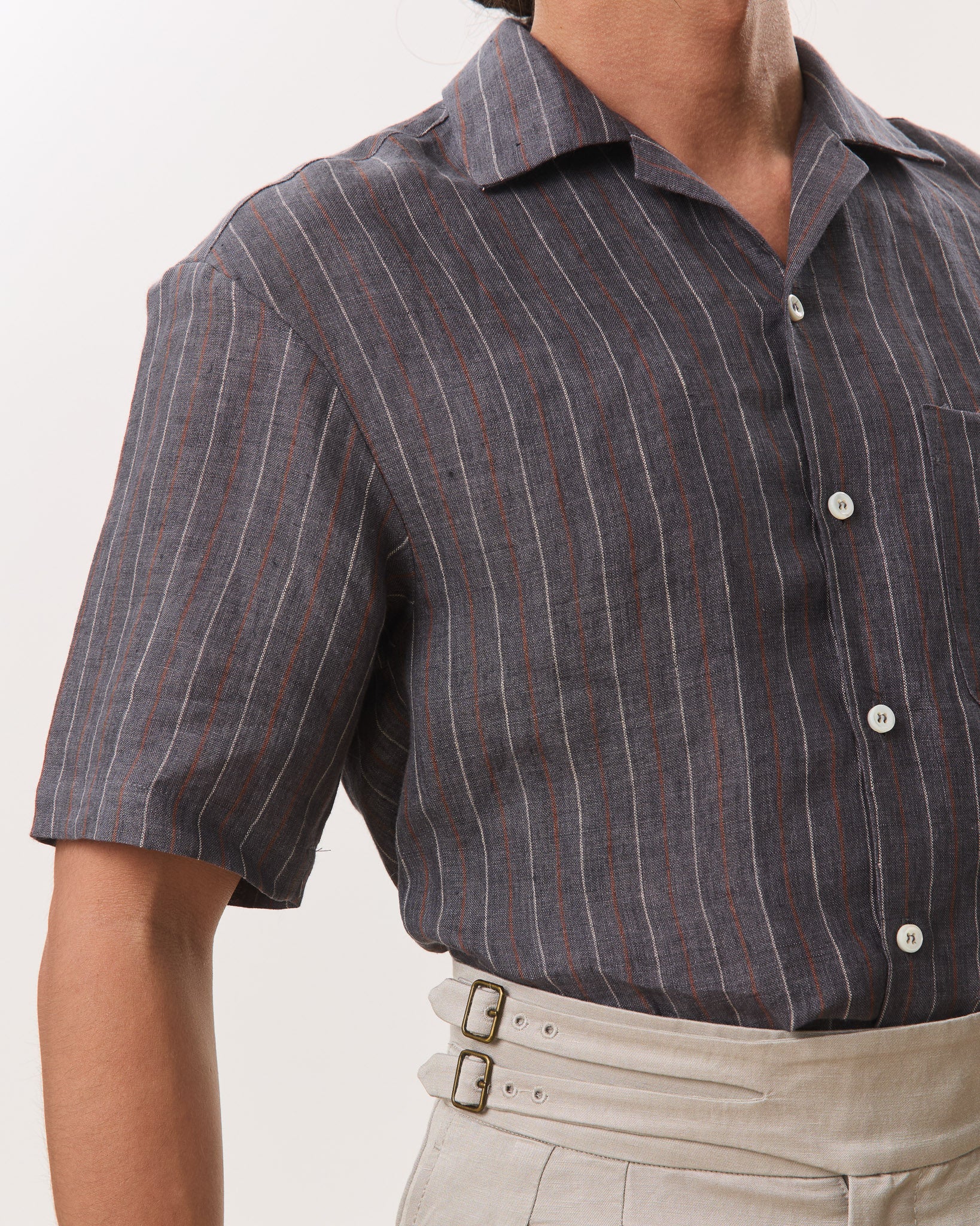 Cut from a breathable 140gsm hemp, this camp collar short sleeve shirt balances natural texture with a lightly structured drape. Designed with a relaxed yet considered silhouette, it features an open camp collar, clean button placket, subtle chest pocket, and a split hem that allows the shirt to be worn comfortably tucked or untucked. The vertical stripe adds quiet visual interest while remaining versatile and understated, making it an easy choice for warm, humid days. Lightweight, breathable, and effortless, this is a refined everyday staple that transitions seamlessly from casual moments to more polished settings.